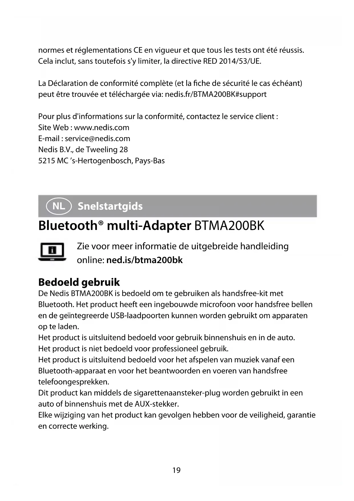 Raadpleeg de gebruiksaanwijzing van je apparaat om te controleren of je apparaat het opladen met 2,4 A ondersteunt. Conformiteitsverklaring Wij, Nedis B.V., verklaren als fabrikant dat het product BTMA200BK van ons merk Nedis , geproduceerd in China, is getest conform alle relevante CE-normen en -voorschriften en dat alle tests met succes zijn doorstaan. Dit omvat, maar is niet beperkt tot de richtlijn RED 2014/53/EU.De volledige conformiteitsverklaring (en het blad met veiligheidsgegevens indien van toepassing) kan worden gevonden en gedownload vianedis.nl/BTMA200BK#supportVoor andere informatie met betrekking tot de naleving neemt u contact op met de klantenservice:Web: www.nedis.nlE-mail: service@nedis.comNedis B.V., de Tweeling 285215 MC ’s-Hertogenbosch, Nederland