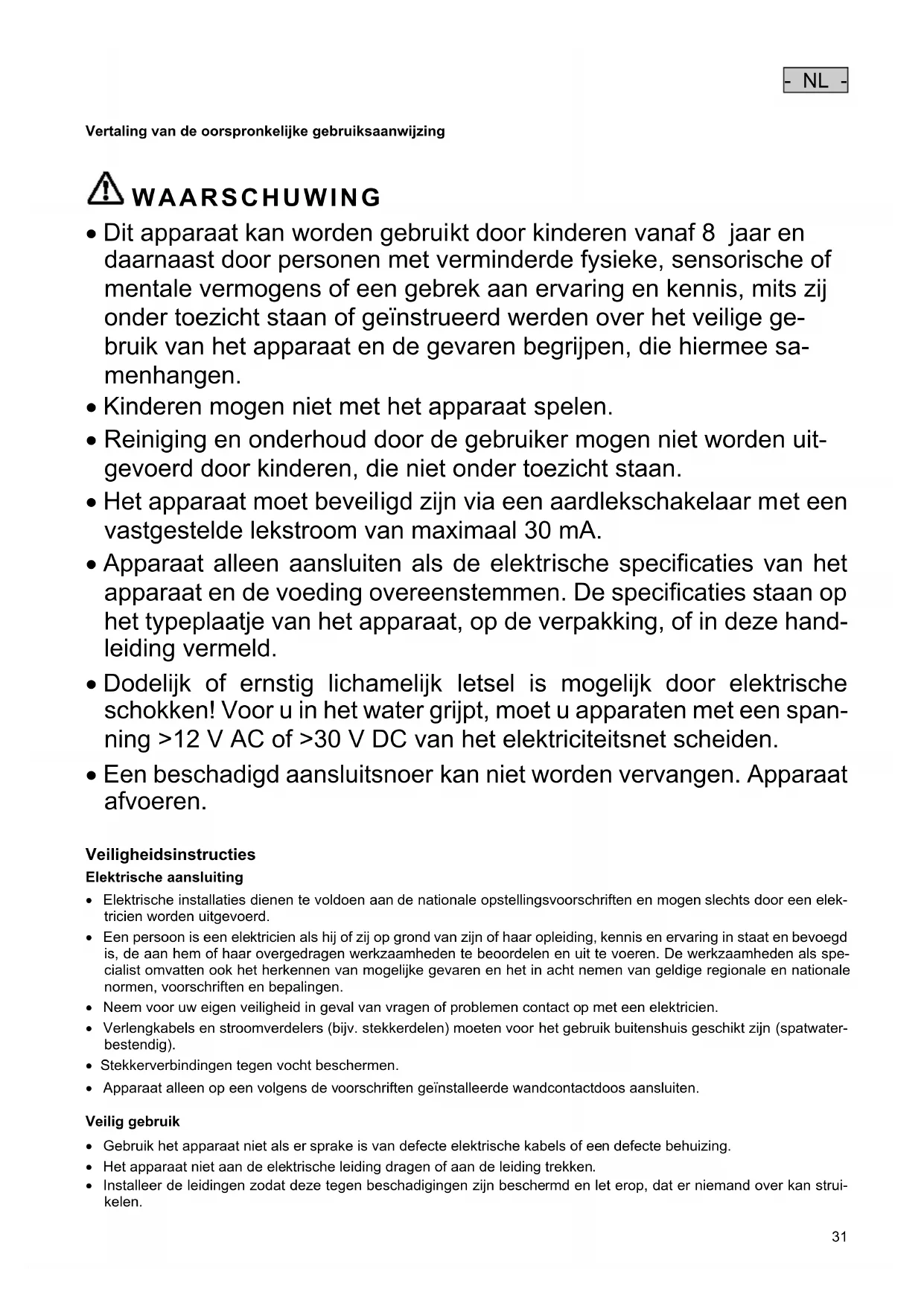- Dit apparaat kan worden gebruikt door kinderen vanaf 8 jaar en daarnaast door personen met verminderde fysieke, sensorische of mentale vermogens of een gebrek aan ervaring en kennis, mits zij onder toezicht staan of geïnstrueerd werden over het veilige ge- bruik van het apparaat en de gevaren begrijpen, die hiermee sa- menhangen.