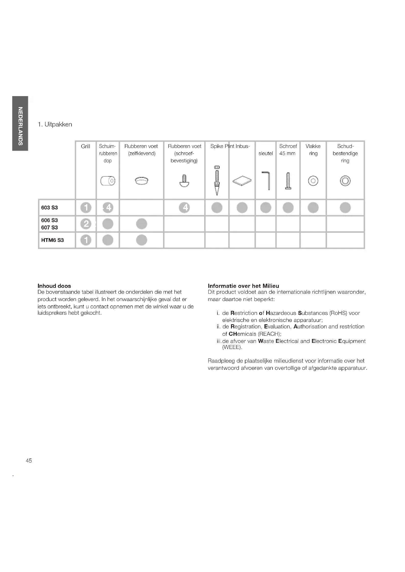 NEDERLANDS Inhoud doos De bovenstaande tabel illustreert de onderdelen die met het product worden geleverd. In het onwaarschijnlijke geval dat er iets ontbreekt, kunt u contact opnemen met de winkel waar u de luidsprekers hebt gekocht. Informatie over het Milieu Dit product voldoet aan de internationale richtlijnen waaronder, maar daartoe niet beperkt: