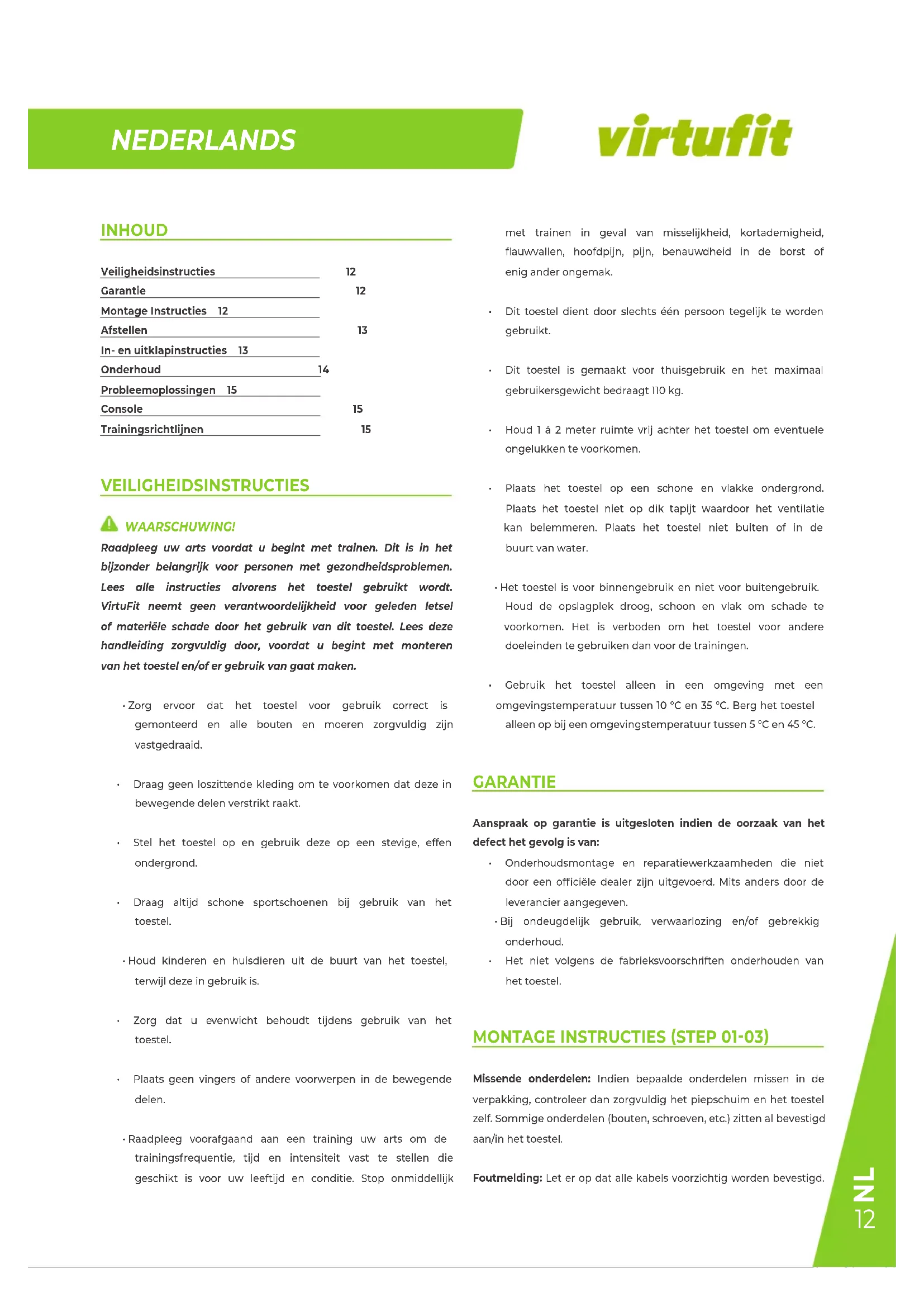 INHOUD Veiligheidsinstructies 12 Garantie 12 Montage Instructies 12 Afstellen 13 In- en uitklapinstructies 13 Onderhoud 14 Probleemoplossingen 15 Console 15 Trainingsrichtlijnen 15 VEILIGHEIDSINSTRUCTIES WAARSCHUWING! Raadpleeg uw arts voordat u begint met trainen. Dit is in het bijzonder belangrijk voor personen met gezondheidsproblemen. Lees alle instructies alvorens het toestel gebruikt wordt. VirtuFit neemt geen verantwoordelijkheid voor geleden letsel of materiële schade door het gebruik van dit toestel. Lees deze handleiding zorgvuldig door, voordat u begint met monteren van het toestel en/of er gebruik van gaat maken.