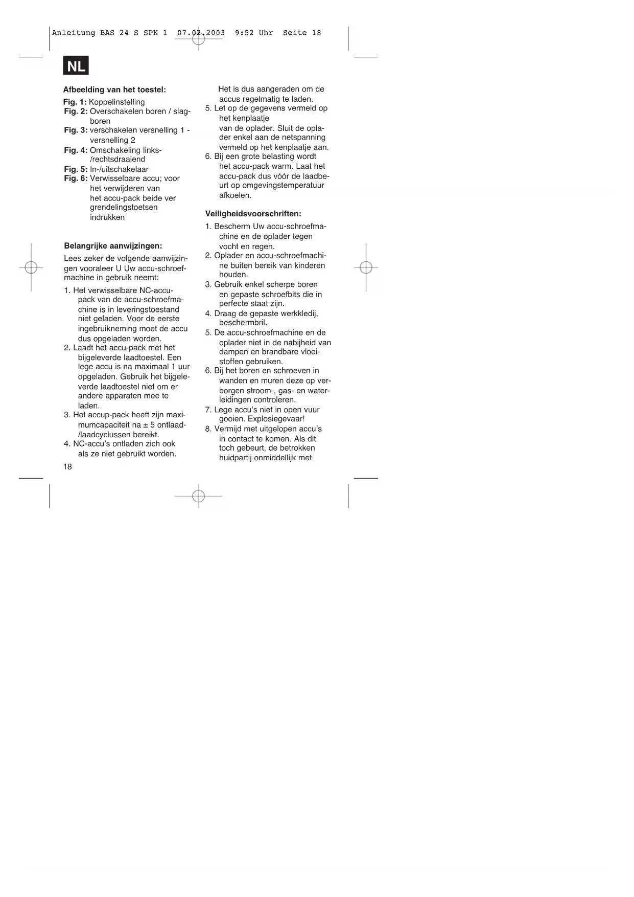Anleitung BAS 24 S SPK 1 07.02.2003 9:52 Uhr Seite 1718 Afbeelding van het toestel: Fig. 1: Koppelinstelling Fig. 2: Overschakelen boren / slag- boren Fig. 3: verschakelen versnelling 1 - versnelling 2 Fig. 4: Omschakeling links- /rechtsdraaiend Fig. 5: In-/uitschakelaar Fig. 6: Verwisselbare accu; voor het verwijderen van het accu-pack beide ver grendelingstoetsen indrukken Belangrijke aanwijzingen: Lees zeker de volgende aanwijzin- gen vooraleer U Uw accu-schroef- machine in gebruik neemt: