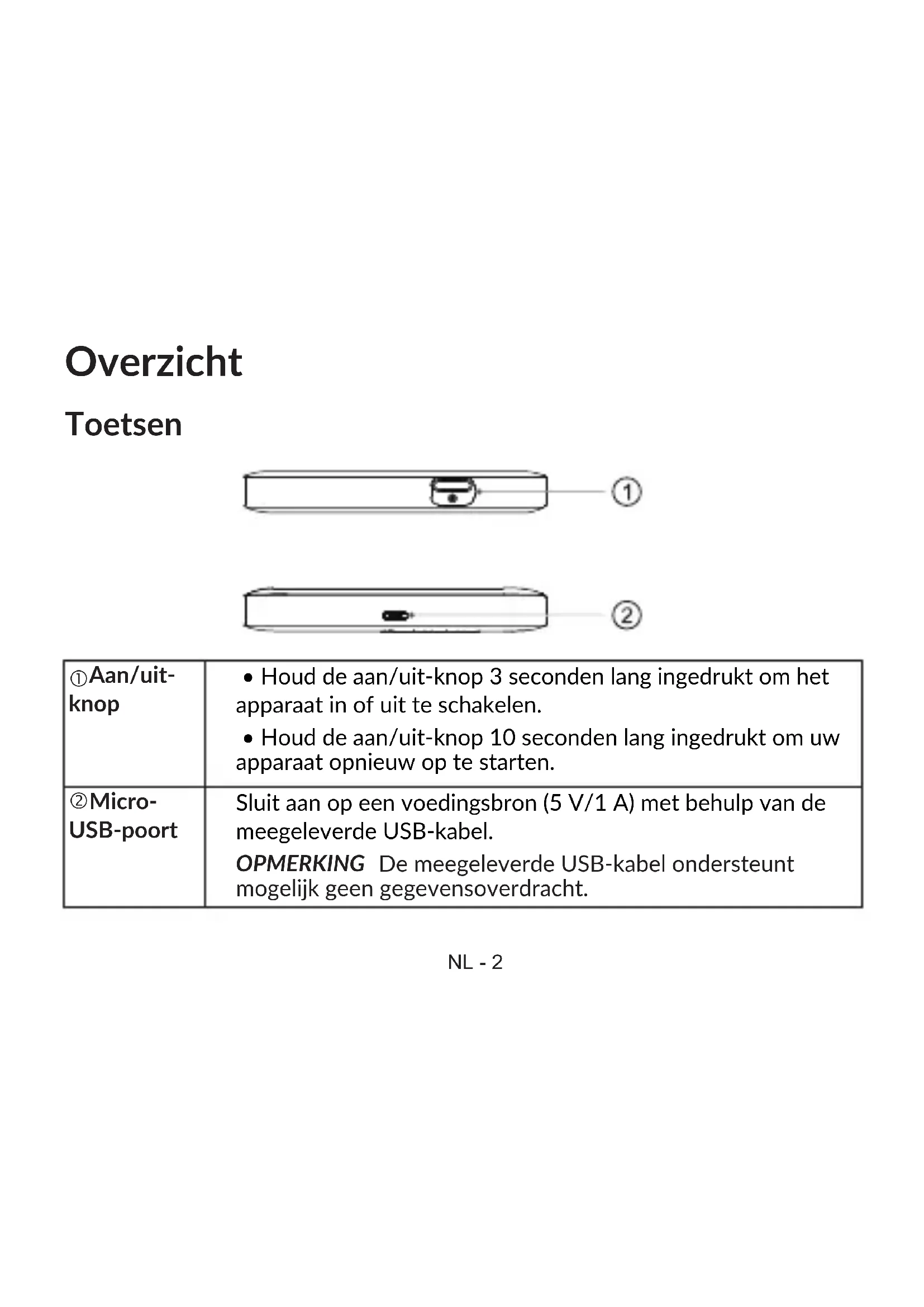 Micro- USB-poort Sluit aan op een voedingsbron (5 V/1 A) met behulp van de meegeleverde USB-kabel. OPMERKING De meegeleverde USB-kabel ondersteunt mogelijk geen gegevensoverdracht. ToetsenNL - 3 Statusledlampjes