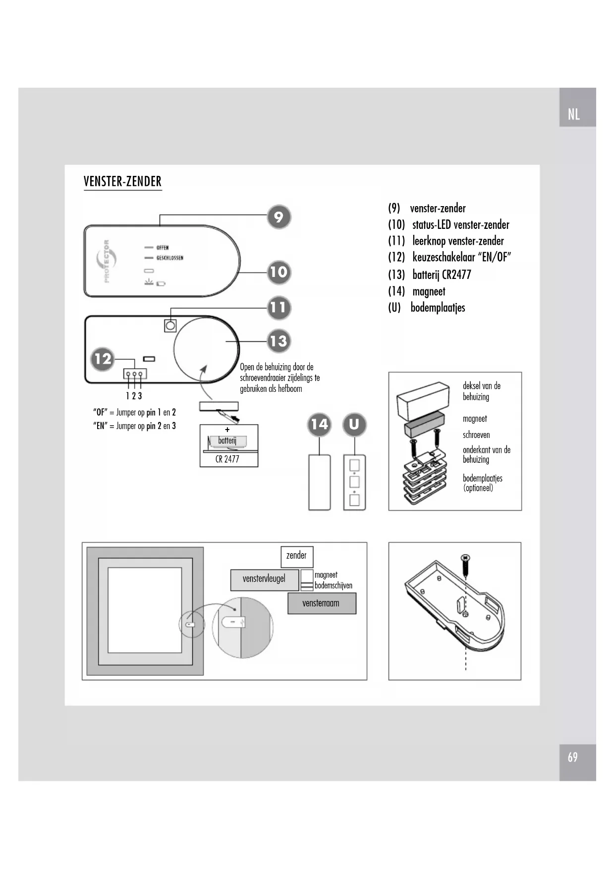 (9) venster-zender (10) status-LED venster-zender (11) leerknop venster-zender (12) keuzeschakelaar “EN/OF” (13) batterij CR2477 (14) magneet (U) bodemplaatjes Open de behuizing door de schroevendraaier zijdelings te gebruiken als hefboom batterijCR 2477 U14 deksel van de behuizingmagneetschroevenonderkant van de behuizingbodemplaatjes (optioneel)