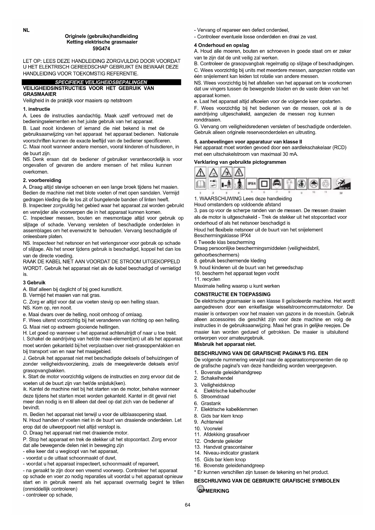 De elektrische grasmaaier is een klasse II geïsoleerde machine. Het wordt aangedreven door een enkelfasige wisselstroomcommutatormotor. De maaier is ontworpen voor het maaien van gazons in de moestuin. Gebruik alleen accessoires die geschikt zijn voor deze machine en volg de instructies in de gebruiksaanwijzing. Maai het gras in gelijke reepjes. De maaier kan worden geduwd of getrokken. De maaier is uitsluitend ontworpen voor amateurgebruik. Misbruik het apparaat niet. BESCHRIJVING VAN DE GRAFISCHE PAGINA'S FIG. EEN De volgende nummering verwijst naar de apparaatcomponenten die op de grafische pagina's van deze handleiding worden weergegeven.