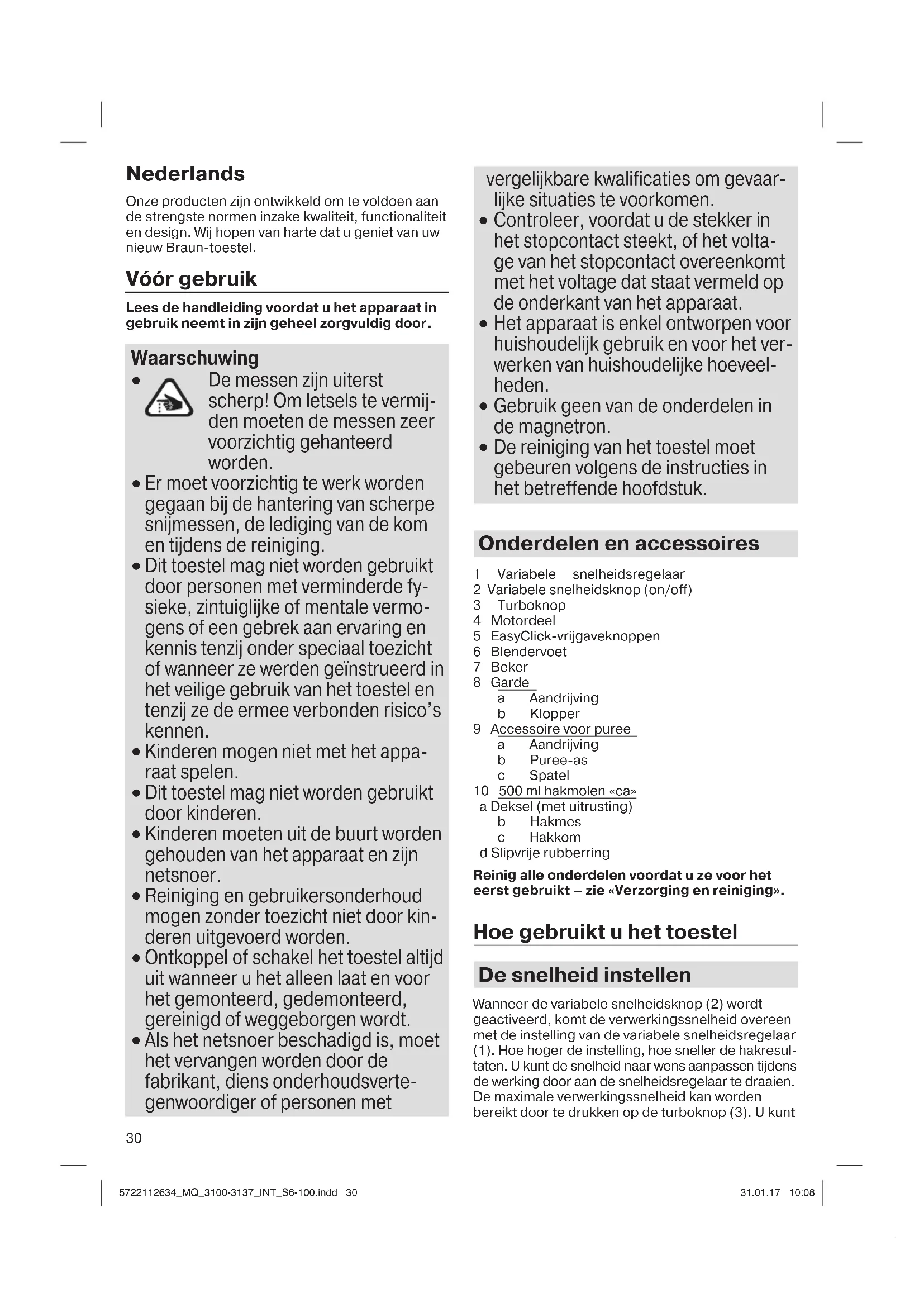 De reiniging van het toestel moet gebeuren volgens de instructies in het betreffende hoofdstuk. Onderdelen en accessoires 1 Variabele snelheidsregelaar 2 Variabele snelheidsknop (on/off) 3 Turboknop 4 Motordeel 5 EasyClick-vrijgaveknoppen 6 Blendervoet 7 Beker 8 Garde a Aandrijving b Klopper 9 Accessoire voor puree a Aandrijving b Puree-as c Spatel 10 500 ml hakmolen «ca» a Deksel (met uitrusting) b Hakmes c Hakkom d Slipvrije rubberring Reinig alle onderdelen voordat u ze voor het eerst gebruikt – zie «Verzorging en reiniging». Hoe gebruikt u het toestel De snelheid instellen Wanneer de variabele snelheidsknop (2) wordt geactiveerd, komt de verwerkingssnelheid overeen met de instelling van de variabele snelheidsregelaar (1). Hoe hoger de instelling, hoe sneller de hakresul- taten. U kunt de snelheid naar wens aanpassen tijdens de werking door aan de snelheidsregelaar te draaien. De maximale verwerkingssnelheid kan worden bereikt door te drukken op de turboknop (3). U kunt 5722112634_MQ_3100-3137_INT_S6-100.indd 305722112634_MQ_3100-3137_INT_S6-100.indd 30 31.01.17 10:0831.01.17 10:0831 de turboknop ook gebruiken voor korte, krachtige pulsen zonder de snelheidsregelaar te moeten regelen. Staafmixervoet (A) De staafmixer is ideaal voor het bereiden van dips, sauzen, dressings, soepen, babyvoeding, drankjes, smoothies en milkshakes. Voor optimale resultaten gebruikt u de turbo- snelheid. Montage en bediening
