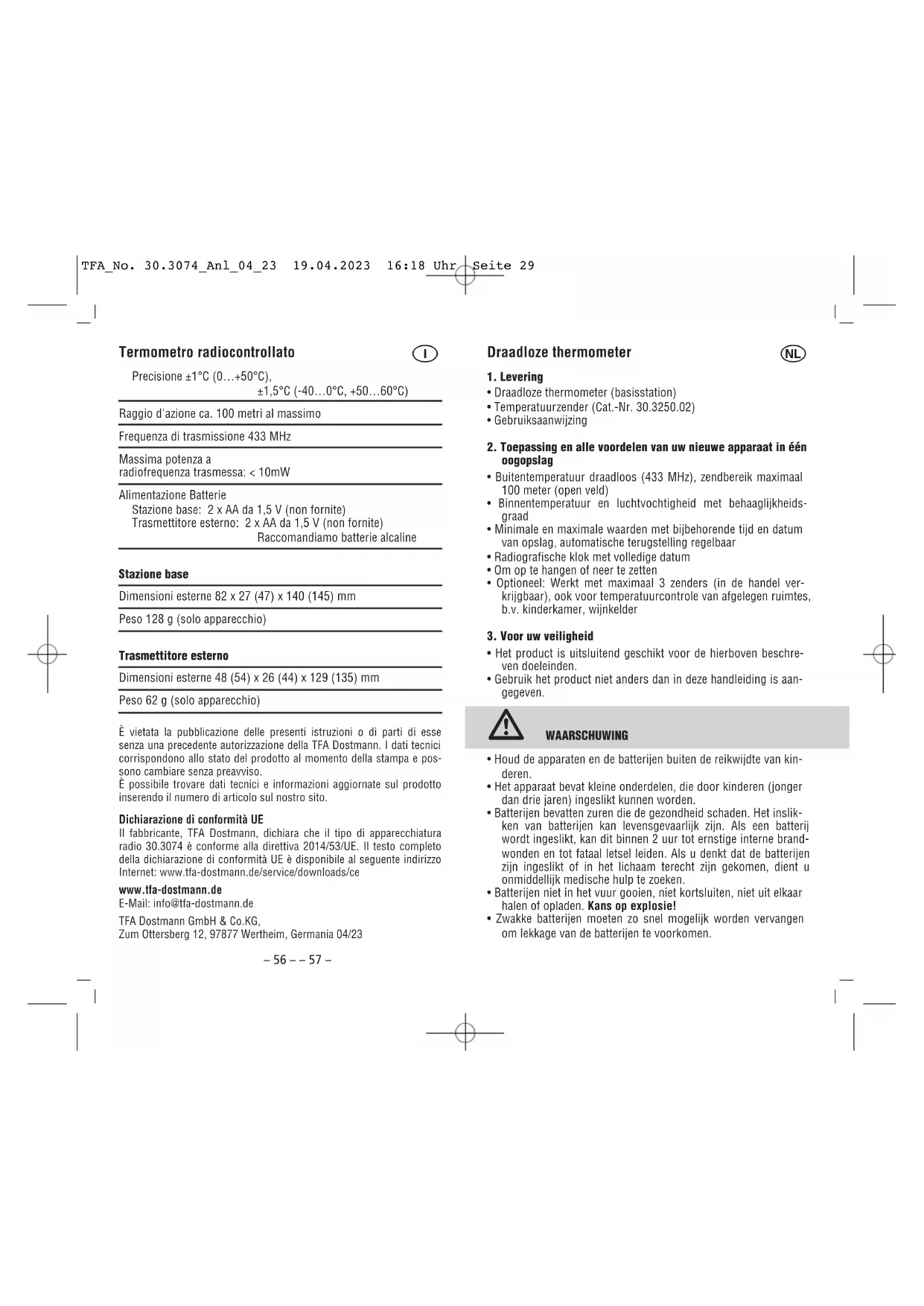 - Zwakke batterijen moeten zo snel mogelijk worden vervangen om lekkage van de batterijen te voorkomen. TFA_No. 30.3074_Anl_04_23 19.04.2023 16:18 Uhr Seite 29– 58 – – 59 – Draadloze thermometer