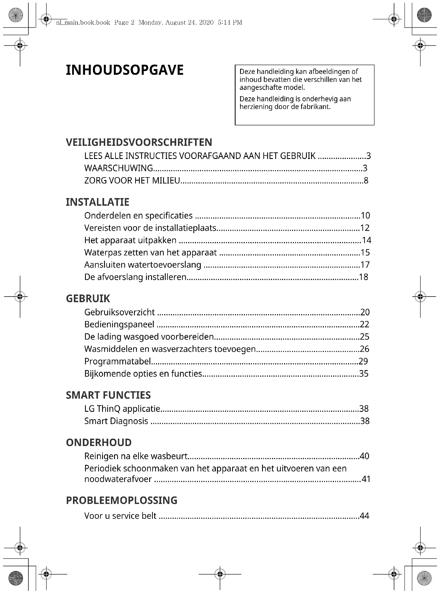 HANDLEIDING WASMACHINE Lees deze instructies aandachtig door voordat u begint met de installatie. Dit zal de installatie vereenvoudigen en ervoor zorgen dat het product goed en veilig is geïnstalleerd. Bewaar deze instructies in de buurt van het product na installatie voor toekomstig gebruik. NEDERLANDS GC3V409N5 / F4WV309S3 MFL71860742 Rev.02_101922 www.lg.com Copyright © 2021-2022 LG Electronics Inc. Alle rechten voorbehouden. nl_main.book.book Page 1 Monday, August 24, 2020 5:14 PMINHOUDSOPGAVE Deze handleiding kan afbeeldingen of inhoud bevatten die verschillen van het aangeschafte model. Deze handleiding is onderhevig aan herziening door de fabrikant. VEILIGHEIDSVOORSCHRIFTEN LEES ALLE INSTRUCTIES VOORAFGAAND AAN HET GEBRUIK ......................3 WAARSCHUWING...............................................................................................3