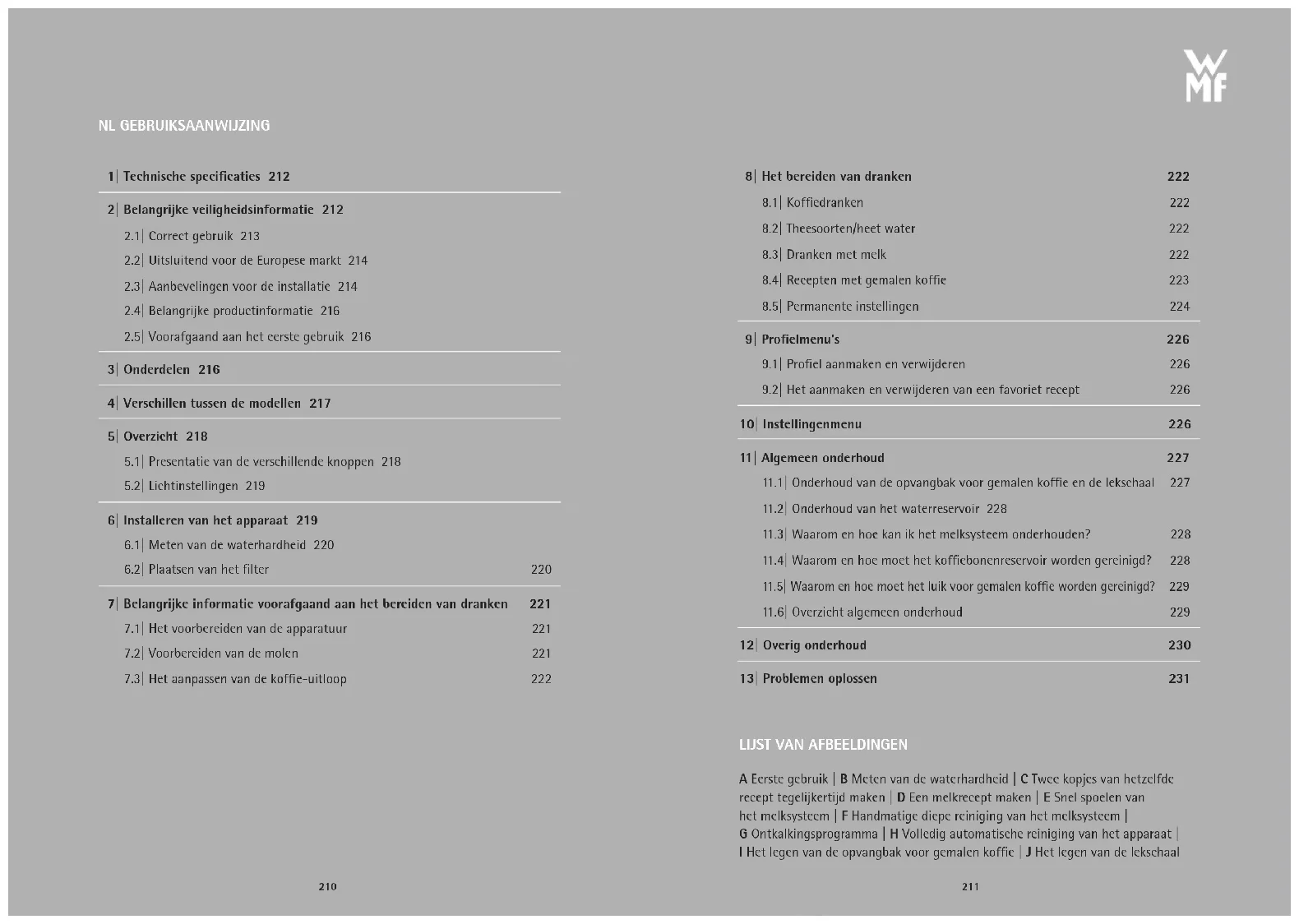 TR SV RU RO PT PL NO NL FI DA CS IT ES FR EN DENL GEBRUIKSAANWIJZING 1|Technische specificaties 212 2|Belangrijke veiligheidsinformatie 212 2.1|Correct gebruik 213 2.2|Uitsluitend voor de Europese markt 214 2.3|Aanbevelingen voor de installatie 214 2.4|Belangrijke productinformatie 216 2.5|Voorafgaand aan het eerste gebruik 216 3|Onderdelen 216 4|Verschillen tussen de modellen 217 5|Overzicht 218 5.1|Presentatie van de verschillende knoppen 218 5.2|Lichtinstellingen 219 6|Installeren van het apparaat 219 6.1|Meten van de waterhardheid 220 6.2|Plaatsen van het filter 220 7|Belangrijke informatie voorafgaand aan het bereiden van dranken 221 7.1|Het voorbereiden van de apparatuur 221 7.2|Voorbereiden van de molen 221 7.3|Het aanpassen van de koffie-uitloop 222 NL GEBRUIKSAANWIJZING 8|Het bereiden van dranken 222 8.1|Koffiedranken 222 8.2|Theesoorten/heet water 222 8.3|Dranken met melk 222 8.4|Recepten met gemalen koffie 223 8.5|Permanente instellingen 224 9|Profielmenu’s 226 9.1|Profiel aanmaken en verwijderen 226 9.2|Het aanmaken en verwijderen van een favoriet recept 226 10|Instellingenmenu 226 11|Algemeen onderhoud 227 11.1|Onderhoud van de opvangbak voor gemalen koffie en de lekschaal 227 11.2|Onderhoud van het waterreservoir 228 11.3|Waarom en hoe kan ik het melksysteem onderhouden? 228 11.4|Waarom en hoe moet het koffiebonenreservoir worden gereinigd? 228 11.5|Waarom en hoe moet het luik voor gemalen koffie worden gereinigd?