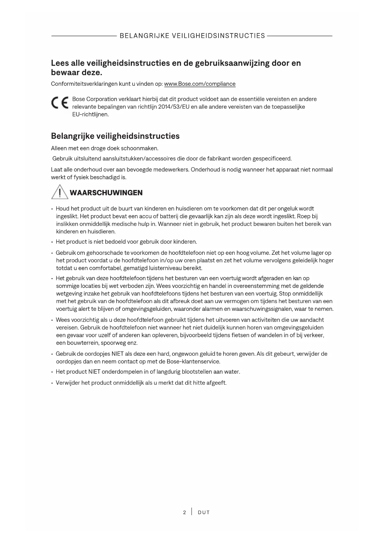DUT Lees alle veiligheidsinstructies en de gebruiksaanwijzing door en bewaar deze. Conformiteitsverklaringen kunt u vinden op: www.Bose.com/compliancewww.Bose.com/compliance Bose Corporation verklaart hierbij dat dit product voldoet aan de essentiële vereisten en andere relevante bepalingen van richtlijn 2014/53/EU en alle andere vereisten van de toepasselijke EU-richtlijnen. Belangrijke veiligheidsinstructies Alleen met een droge doek schoonmaken. Gebruik uitsluitend aansluitstukken/accessoires die door de fabrikant worden gespecificeerd. Laat alle onderhoud over aan bevoegde medewerkers. Onderhoud is nodig wanneer het apparaat niet normaal werkt of fysiek beschadigd is. WAARSCHUWINGEN