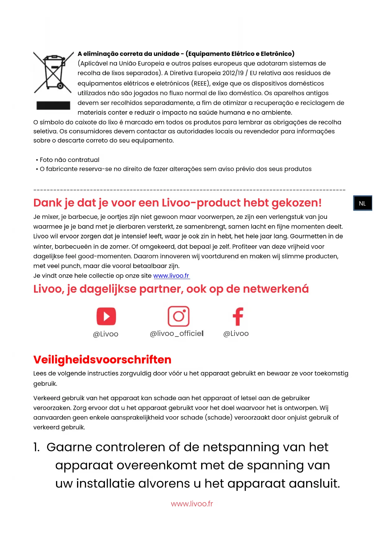 Dank je dat je voor een Livoo-product hebt gekozen! Je mixer, je barbecue, je oortjes zijn niet gewoon maar voorwerpen, ze zijn een verlengstuk van jou waarmee je je band met je dierbaren versterkt, ze samenbrengt, samen lacht en fijne momenten deelt. Livoo wil ervoor zorgen dat je intensief leeft, waar je ook zin in hebt, het hele jaar lang. Gourmetten in de winter, barbecueën in de zomer. Of omgekeerd, dat bepaal je zelf. Profiteer van deze vrijheid voor dagelijkse feel good-momenten. Daarom innoveren wij voortdurend en maken wij slimme producten, met veel punch, maar die vooral betaalbaar zijn. Je vindt onze hele collectie op onze site www.livoo.fr Livoo, je dagelijkse partner, ook op de netwerken.