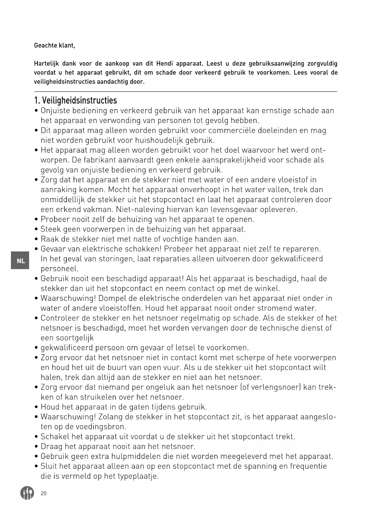 Geachte klant, Hartelijk dank voor de aankoop van dit Hendi apparaat. Leest u deze gebruiksaanwijzing zorgvuldig voordat u het apparaat gebruikt, dit om schade door verkeerd gebruik te voorkomen. Lees vooral de veiligheidsinstructies aandachtig door.