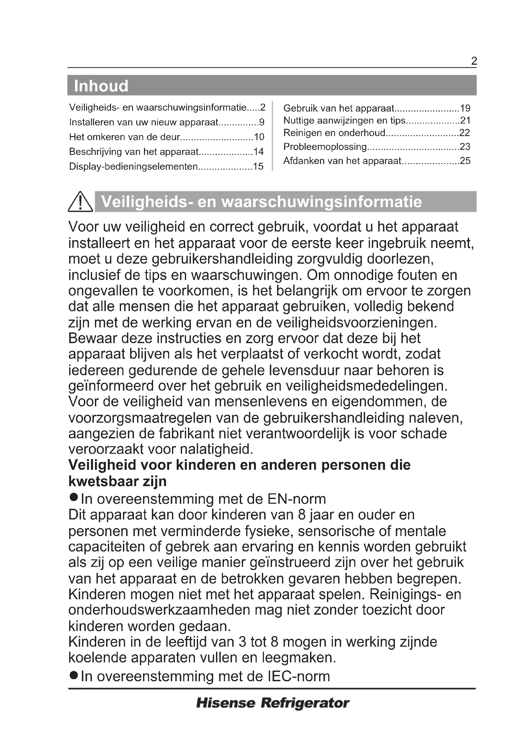 In overeenstemming met de EN-norm Dit apparaat kan door kinderen van 8 jaar en ouder en personen met verminderde fysieke, sensorische of mentale capaciteiten of gebrek aan ervaring en kennis worden gebruikt als zij op een veilige manier geïnstrueerd zijn over het gebruik van het apparaat en de betrokken gevaren hebben begrepen. Kinderen mogen niet met het apparaat spelen. Reinigings- en onderhoudswerkzaamheden mag niet zonder toezicht door kinderen worden gedaan. Kinderen in de leeftijd van 3 tot 8 mogen in werking zijnde koelende apparaten vullen en leegmaken.