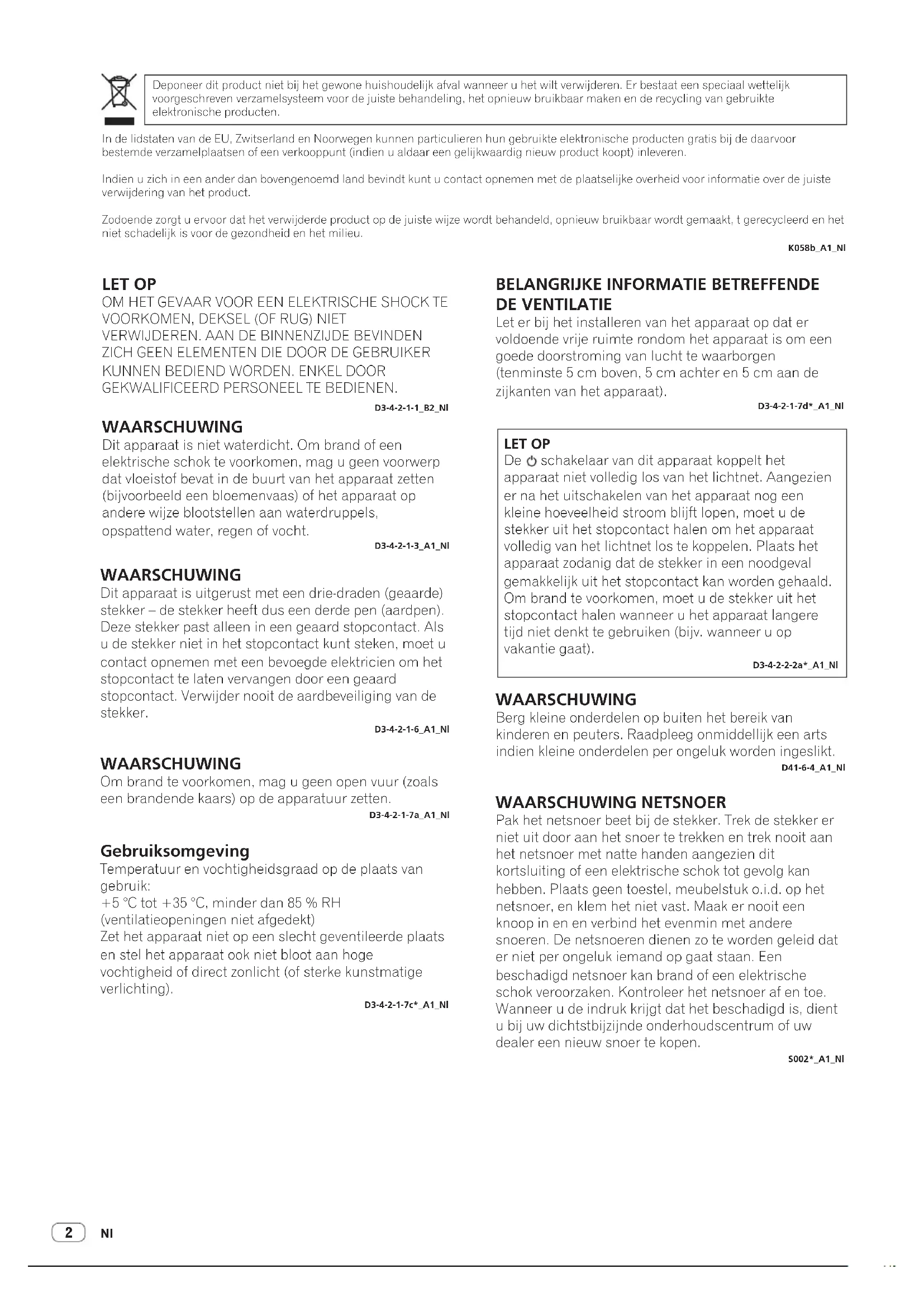 DE VENTILATIE Let er bij het installeren van het apparaat op dat er voldoende vrije ruimte rondom het apparaat is om een goede doorstroming van lucht te waarborgen (tenminste 5 cm boven, 5 cm achter en 5 cm aan de zijkanten van het apparaat). D3-4-2-1-7d*_A1_Nl LET OP De schakelaar van dit apparaat koppelt het apparaat niet volledig los van het lichtnet. Aangezien er na het uitschakelen van het apparaat nog een kleine hoeveelheid stroom blijft lopen, moet u de stekker uit het stopcontact halen om het apparaat volledig van het lichtnet los te koppelen. Plaats het apparaat zodanig dat de stekker in een noodgeval gemakkelijk uit het stopcontact kan worden gehaald. Om brand te voorkomen, moet u de stekker uit het stopcontact halen wanneer u het apparaat langere tijd niet denkt te gebruiken (bijv. wanneer u op vakantie gaat). D3-4-2-2-2a*_A1_Nl WAARSCHUWING Berg kleine onderdelen op buiten het bereik van kinderen en peuters. Raadpleeg onmiddellijk een arts indien kleine onderdelen per ongeluk worden ingeslikt. D41-6-4_A1_Nl Deponeer dit product niet bij het gewone huishoudelijk afval wanneer u het wilt verwijderen. Er bestaat een speciaal wettelijk voorgeschreven verzamelsysteem voor de juiste behandeling, het opnieuw bruikbaar maken en de recycling van gebruikte elektronische producten. In de lidstaten van de EU, Zwitserland en Noorwegen kunnen particulieren hun gebruikte elektronische producten gratis bij de daarvoor bestemde verzamelplaatsen of een verkooppunt (indien u aldaar een gelijkwaardig nieuw product koopt) inleveren. Indien u zich in een ander dan bovengenoemd land bevindt kunt u contact opnemen met de plaatselijke overheid voor informatie over de juiste verwijdering van het product. Zodoende zorgt u ervoor dat het verwijderde product op de juiste wijze wordt behandeld, opnieuw bruikbaar wordt gemaakt, t gerecycleerd en het niet schadelijk is voor de gezondheid en het milieu. K058b_A1_Nl WAARSCHUWING NETSNOER Pak het netsnoer beet bij de stekker. Trek de stekker er niet uit door aan het snoer te trekken en trek nooit aan het netsnoer met natte handen aangezien dit kortsluiting of een elektrische schok tot gevolg kan hebben. Plaats geen toestel, meubelstuk o.i.d. op het netsnoer, en klem het niet vast. Maak er nooit een knoop in en en verbind het evenmin met andere snoeren. De netsnoeren dienen zo te worden geleid dat er niet per ongeluk iemand op gaat staan. Een beschadigd netsnoer kan brand of een elektrische schok veroorzaken. Kontroleer het netsnoer af en toe. Wanneer u de indruk krijgt dat het beschadigd is, dient u bij uw dichtstbijzijnde onderhoudscentrum of uw dealer een nieuw snoer te kopen. S002*_A1_NlNl