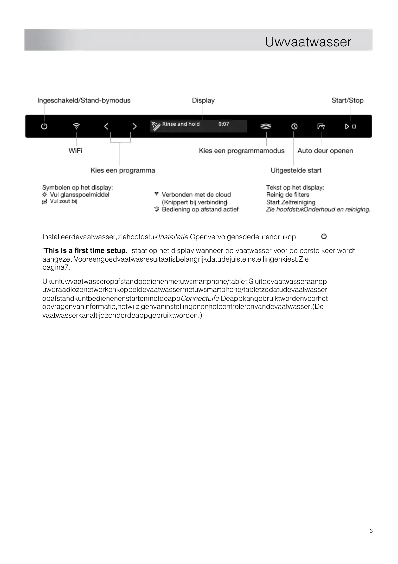 Neem contact op met de dichtstbijzijnde servicedienst ................................................ 48Reserveonderdelen ..................................... 48Aantal cycli ................................................. 49Technische gegevens en energielabel ..... 49Technische gegevens ................................. 49Informatie voor consumenten ...................... 49Informatie voor testinstituut .......................... 49Verklaring van conformiteit .......................... InhoudsopgaveVul zout bij Display Start/Stop Kies een programmamodus Kies een programma Auto deur openen Uitgestelde start Ingeschakeld/Stand-bymodus WiFi Verbonden met de cloud (Knippert bij verbinding) Symbolen op het display: Vul glansspoelmiddel Tekst op het display: Reinig de filters Start Zelfreiniging Zie hoofdstukOnderhoud en reiniging.Bediening op afstand actief Installeer de vaatwasser, zie hoofdstuk Installatie. Open vervolgens de deur en druk op . "This is a first time setup." staat op het display wanneer de vaatwasser voor de eerste keer wordt aangezet. Voor een goed vaatwasresultaat is belangrijk dat u de juiste instellingen kiest. Zie pagina 7. U kunt uw vaatwasser op afstand bedienen met uw smartphone/tablet. Sluit de vaatwasser aan op uw draadloze netwerk en koppel de vaatwasser met uw smartphone/tablet zodat u de vaatwasser op afstand kunt bedienen en starten met de app ConnectLife. De app kan gebruikt worden voor het opvragen van informatie, het wijzigen van instellingen en het controleren van de vaatwasser. (De vaatwasser kan altijd zonder de app gebruikt worden.)