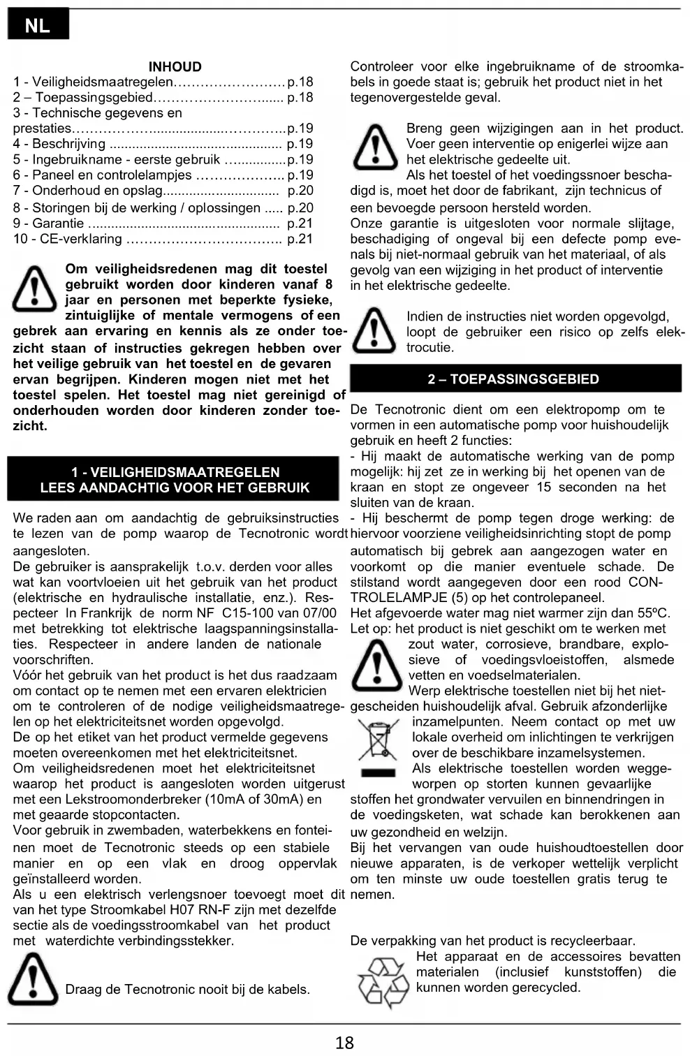 We raden aan om aandachtig de gebruiksinstructies te lezen van de pomp waarop de Tecnotronic wordt aangesloten. De gebruiker is aansprakelijk t.o.v. derden voor alles wat kan voortvloeien uit het gebruik van het product (elektrische en hydraulische installatie, enz.). Res- pecteer In Frankrijk de norm NF C15-100 van 07/00 met betrekking tot elektrische laagspanningsinstalla- ties. Respecteer in andere landen de nationale voorschriften. Vóór het gebruik van het product is het dus raadzaam om contact op te nemen met een ervaren elektricien om te controleren of de nodige veiligheidsmaatrege- len op het elektriciteitsnet worden opgevolgd. De op het etiket van het product vermelde gegevens moeten overeenkomen met het elektriciteitsnet. Om veiligheidsredenen moet het elektriciteitsnet waarop het product is aangesloten worden uitgerust met een Lekstroomonderbreker (10mA of 30mA) en met geaarde stopcontacten. Voor gebruik in zwembaden, waterbekkens en fontei- nen moet de Tecnotronic steeds op een stabiele manier en op een vlak en droog oppervlak geïnstalleerd worden. Als u een elektrisch verlengsnoer toevoegt moet dit van het type Stroomkabel H07 RN-F zijn met dezelfde sectie als de voedingsstroomkabel van het product met waterdichte verbindingsstekker. Draag de Tecnotronic nooit bij de kabels. Controleer voor elke ingebruikname of de stroomka- bels in goede staat is; gebruik het product niet in het tegenovergestelde geval. Breng geen wijzigingen aan in het product. Voer geen interventie op enigerlei wijze aan het elektrische gedeelte uit. Als het toestel of het voedingssnoer bescha- digd is, moet het door de fabrikant, zijn technicus of een bevoegde persoon hersteld worden. Onze garantie is uitgesloten voor normale slijtage, beschadiging of ongeval bij een defecte pomp eve- nals bij niet-normaal gebruik van het materiaal, of als gevolg van een wijziging in het product of interventie in het elektrische gedeelte. Indien de instructies niet worden opgevolgd, loopt de gebruiker een risico op zelfs elek- trocutie. 2 – TOEPASSINGSGEBIED De Tecnotronic dient om een elektropomp om te vormen in een automatische pomp voor huishoudelijk gebruik en heeft 2 functies: - Hij maakt de automatische werking van de pomp mogelijk: hij zet ze in werking bij het openen van de kraan en stopt ze ongeveer 15 seconden na het sluiten van de kraan. - Hij beschermt de pomp tegen droge werking: de hiervoor voorziene veiligheidsinrichting stopt de pomp automatisch bij gebrek aan aangezogen water en voorkomt op die manier eventuele schade. De stilstand wordt aangegeven door een rood CON- TROLELAMPJE (5) op het controlepaneel. Het afgevoerde water mag niet warmer zijn dan 55ºC. Let op: het product is niet geschikt om te werken met zout water, corrosieve, brandbare, explo- sieve of voedingsvloeistoffen, alsmede vetten en voedselmaterialen. Werp elektrische toestellen niet bij het niet- gescheiden huishoudelijk afval. Gebruik afzonderlijke inzamelpunten. Neem contact op met uw lokale overheid om inlichtingen te verkrijgen over de beschikbare inzamelsystemen. Als elektrische toestellen worden wegge- worpen op storten kunnen gevaarlijke stoffen het grondwater vervuilen en binnendringen in de voedingsketen, wat schade kan berokkenen aan uw gezondheid en welzijn. Bij het vervangen van oude huishoudtoestellen door nieuwe apparaten, is de verkoper wettelijk verplicht om ten minste uw oude toestellen gratis terug te nemen. De verpakking van het product is recycleerbaar. Het apparaat en de accessoires bevatten materialen (inclusief kunststoffen) die kunnen worden gerecycled. NL19
