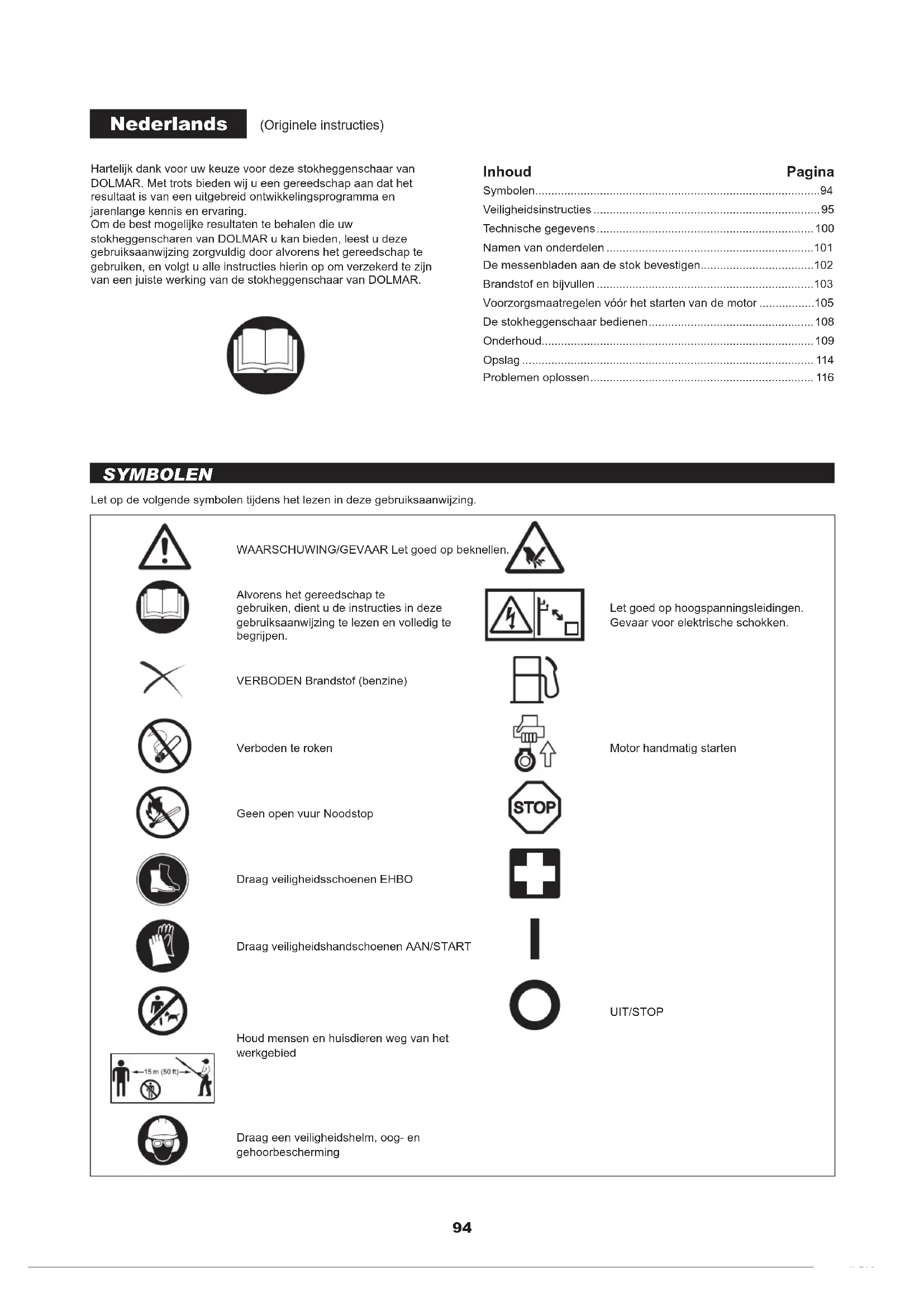 - Hartelijk dank voor uw keuze voor deze stokheggenschaar van DOLMAR. Met trots bieden wij u een gereedschap aan dat het resultaat is van een uitgebreid ontwikkelingsprogramma en jarenlange kennis en ervaring. Om de best mogelijke resultaten te behalen die uw stokheggenscharen van DOLMAR u kan bieden, leest u deze gebruiksaanwijzing zorgvuldig door alvorens het gereedschap te gebruiken, en volgt u alle instructies hierin op om verzekerd te zijn van een juiste werking van de stokheggenschaar van DOLMAR. Nederlands (Originele instructies) Inhoud Pagina Symbolen p. 94