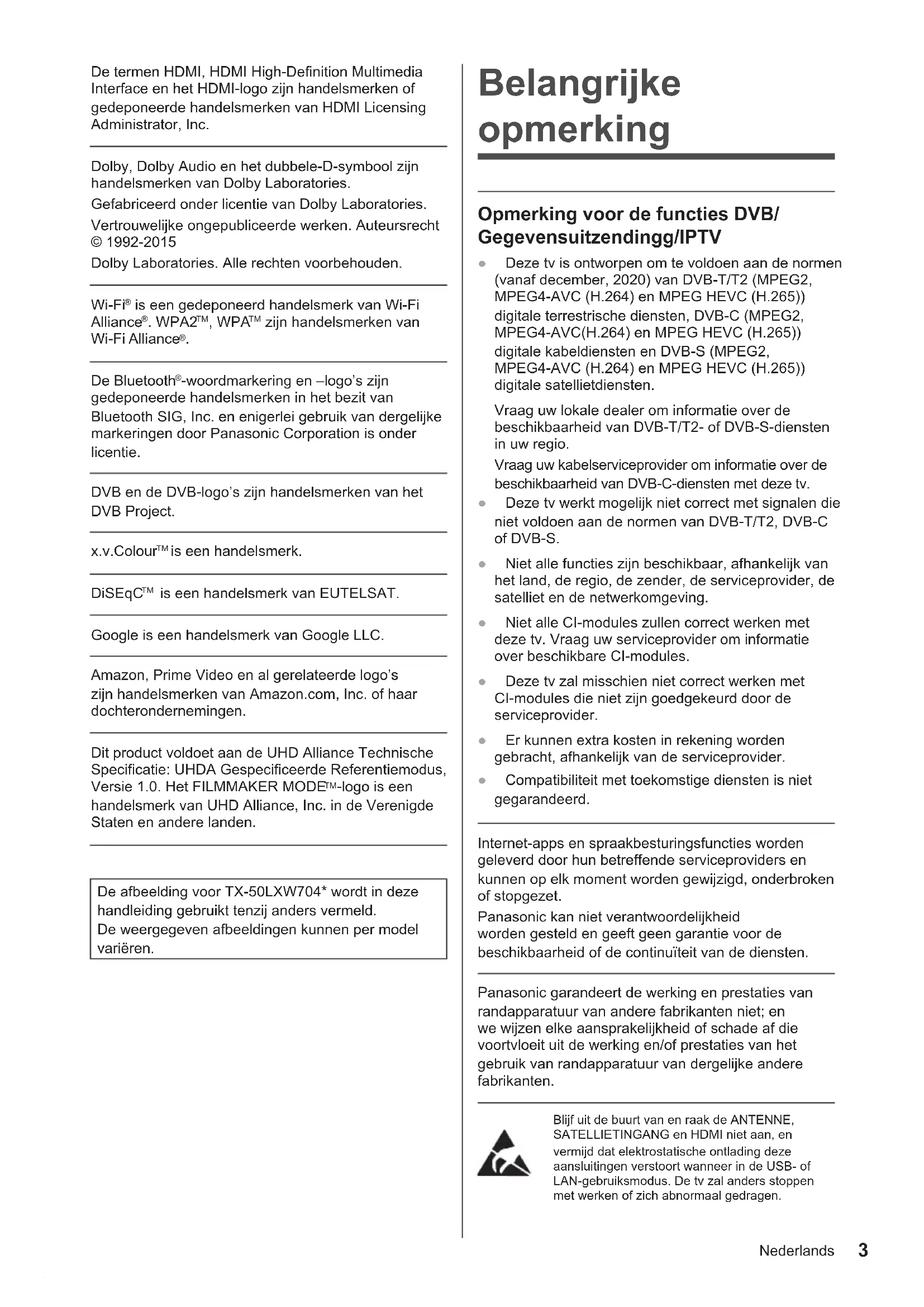 -logo is een handelsmerk van UHD Alliance, Inc. in de Verenigde Staten en andere landen. De afbeelding voor TX-50LXW704* wordt in deze handleiding gebruikt tenzij anders vermeld. De weergegeven afbeeldingen kunnen per model variëren. Belangrijke opmerking Opmerking voor de functies DVB/ Gegevensuitzendingg/IPTV ● Deze tv is ontworpen om te voldoen aan de normen (vanaf december, 2020) van DVB-T/T2 (MPEG2, MPEG4-AVC (H.264) en MPEG HEVC (H.265)) digitale terrestrische diensten, DVB-C (MPEG2, MPEG4-AVC(H.264) en MPEG HEVC (H.265)) digitale kabeldiensten en DVB-S (MPEG2, MPEG4-AVC (H.264) en MPEG HEVC (H.265)) digitale satellietdiensten. Vraag uw lokale dealer om informatie over de beschikbaarheid van DVB-T/T2- of DVB-S-diensten in uw regio. Vraag uw kabelserviceprovider om informatie over de beschikbaarheid van DVB-C-diensten met deze tv. ● Deze tv werkt mogelijk niet correct met signalen die niet voldoen aan de normen van DVB-T/T2, DVB-C of DVB-S. ● Niet alle functies zijn beschikbaar, afhankelijk van het land, de regio, de zender, de serviceprovider, de satelliet en de netwerkomgeving. ● Niet alle CI-modules zullen correct werken met deze tv. Vraag uw serviceprovider om informatie over beschikbare CI-modules. ● Deze tv zal misschien niet correct werken met CI-modules die niet zijn goedgekeurd door de serviceprovider. ● Er kunnen extra kosten in rekening worden gebracht, afhankelijk van de serviceprovider. ● Compatibiliteit met toekomstige diensten is niet gegarandeerd. Internet-apps en spraakbesturingsfuncties worden geleverd door hun betreffende serviceproviders en kunnen op elk moment worden gewijzigd, onderbroken of stopgezet. Panasonic kan niet verantwoordelijkheid worden gesteld en geeft geen garantie voor de beschikbaarheid of de continuïteit van de diensten. Panasonic garandeert de werking en prestaties van randapparatuur van andere fabrikanten niet; en we wijzen elke aansprakelijkheid of schade af die voortvloeit uit de werking en/of prestaties van het gebruik van randapparatuur van dergelijke andere fabrikanten. Blijf uit de buurt van en raak de ANTENNE, SATELLIETINGANG en HDMI niet aan, en vermijd dat elektrostatische ontlading deze aansluitingen verstoort wanneer in de USB- of LAN-gebruiksmodus. De tv zal anders stoppen met werken of zich abnormaal gedragen.Nederlands