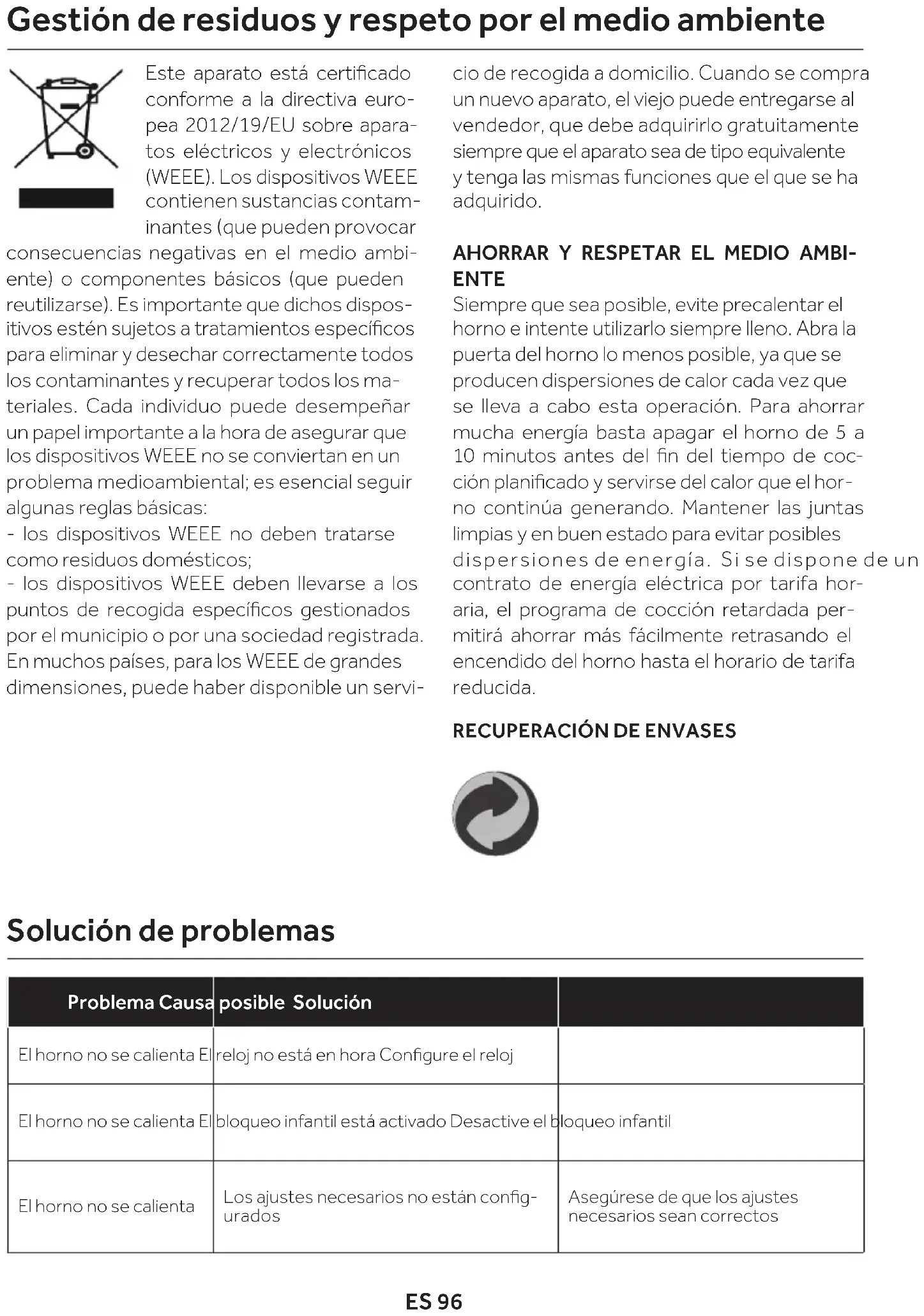 HET MILIEU Indien mogelijk, vermijd het voorverwarmen van de oven en vermijd om de oven zonder inhoud te laten draaien. Laat de ovendeur niet open alleen wanneer dat nodig is, omdat er warmteverlies ontstaat elke keer dat de oven open staat. Voor een aanzienlijke energiebe- sparing, schakelt u de oven 5 tot 10 minuten uit voor het voorziene einde van de bereid- ingstijd en gebruik de warmte die de oven blijft genereren. Houd de dichtingen schoon en in goede staat, om energieverlies te voorkomen. Als u een contract heeft met een laag energie tarief, kunt u gebruik maken van het “uitgesteld koken”. Deze zal uw programma laten starten in een periode waar u aan een voordelig tarief kookt. Dit helpt u bij het besparen van energie.PT 116 Instruções de segurança Indicações De Carácter Geral Descrição do produto Descrição do visor Modos de cozedura Conetividade Limpeza e manutenção do forno Manutenção Resolução de problemas Installation Resumo