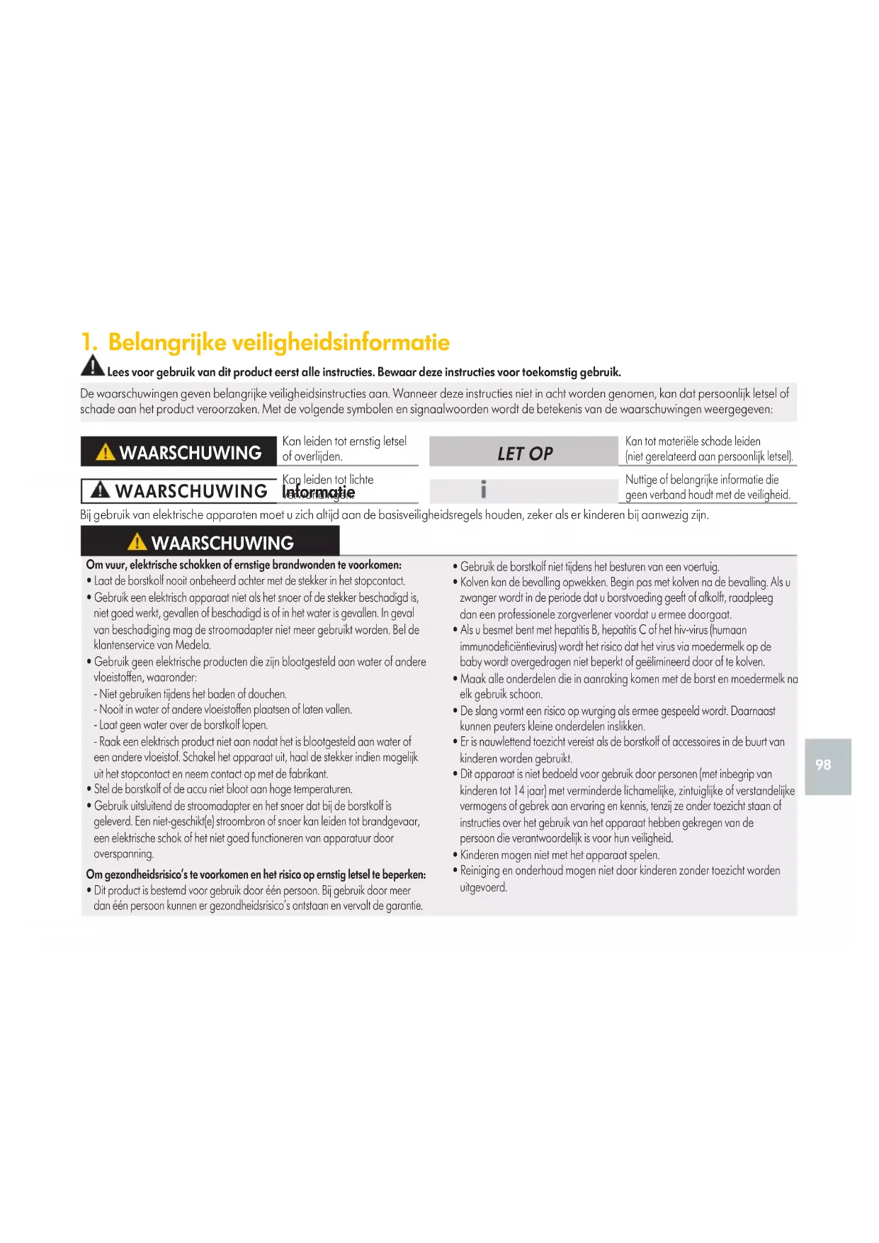 Lees voor gebruik van dit product eerst alle instructies. Bewaar deze instructies voor toekomstig gebruik. De waarschuwingen geven belangrijke veiligheidsinstructies aan. Wanneer deze instructies niet in acht worden genomen, kan dat persoonlijk letsel of schade aan het product veroorzaken. Met de volgende symbolen en signaalwoorden wordt de betekenis van de waarschuwingen weergegeven: Kan leiden tot ernstig letsel of overlijden. Kan tot materiële schade leiden (niet gerelateerd aan persoonlijk letsel). WAARSCHUWING LET OP Kan leiden tot lichte verwondingen. Nuttige of belangrijke informatie die geen verband houdt met de veiligheid. WAARSCHUWING Informatie Bij gebruik van elektrische apparaten moet u zich altijd aan de basisveiligheidsregels houden, zeker als er kinderen bij aanwezig zijn. WAARSCHUWING Om vuur, elektrische schokken of ernstige brandwonden te voorkomen:
