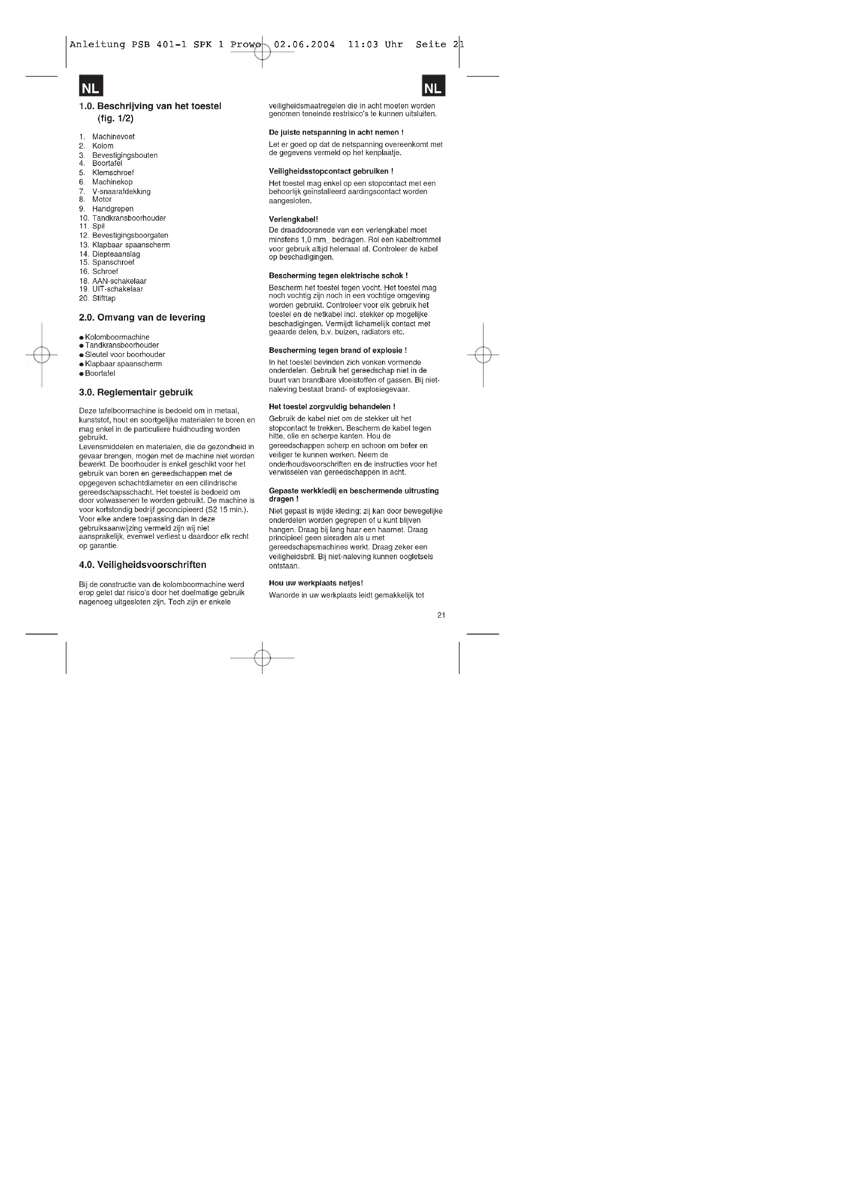 moerplaatjes. Boortafel (4) met boortafelhouder de kolom (2) op schuiven (fig. 4). Zet de boortafel in de gewenste stand vast m.b.v. de klemschroef (5). Boorkop (6) met v-snaarafdekking (7) en motor (8) op de boorkolom plaatsen en bevestigen d.m.v. de inbusschroeven (13). Drie hendels (9) aan het aanzethandkruis schroeven. Aanwijzing: Als bescherming tegen corrosie zijn alle blanke onderdelen ingevet. Vóór u de boorhouder (10) op de spil (11) plaatst moet u de beide onderdelen helemaal van vet ontdoen m.b.v. een milieuvriendelijk oplosmiddel opdat een optimale krachtoverbrenging verzekerd is. Boorhouder op de spil plaatsen. 6.2. Opstellen van de machine Vóór de inbedrijfstelling moet de boormachine vast en met haar hele oppervlak rustend op de werkplaat van een vast staande werkbank worden gemonteerd. Gebruik daarvoor de beide montageboorgaten (12) in de onderplaat. Let erop dat de machine voor het bedrijf en voor afstel- en onderhoudswerkzaamheden vrij toegankelijk is. Aanwijzing : De bevestigingsschroeven mogen enkel hard worden aangehaald zodat de grondplaat niet krom wordt getrokken of zich vervormd. Bij bovenmatige belasting bestaat breukgevaar. 6.3. Klapbaar spaanscherm (fig. 4) De drie kruiskopschroeven (21) uitdraaien. Transparante afdekking (23) de gleuf van het rode montageraam (24) in schuiven en opnieuw fixeren d.m.v. de kruiskopschroeven (21). De hoogte van de afdekking (23) is traploos afstelbaar en wordt gefixeerd m.b.v. de beide vleugelschroeven (22). Om van boor te verwisselen kan het spaanscherm (13) omhoog worden geklapt. Vóór het aanzetten van de machine moet het spaanscherm (13) echter terug in zijn uitgangspositie worden gebracht. 6.4. Vóór de inbedrijfstelling in acht nemen Let er wel op dat de netspanning overeenkomt met de gegevens vermeld op het kenplaatje. Sluit de machine enkel aan op een stopcontact met een behoorlijk geïnstalleerd aardingscontact. De tafelboormachine is voorzien van een nulspanningsuitschakelinrichting die de bediener beschermt tegen onbedoelde herstart van de machine na een wegvallen van de spanning. In dit geval moet de machine opnieuw worden aangezet. 7.0. Bedrijf Draag bij het werken met de tafelboormachine een gepaste nauwsluitende beschermende kleding. Draag altijd een veiligheidsbril! Draag bij lang haar altijd een haarnet (of een pet)!