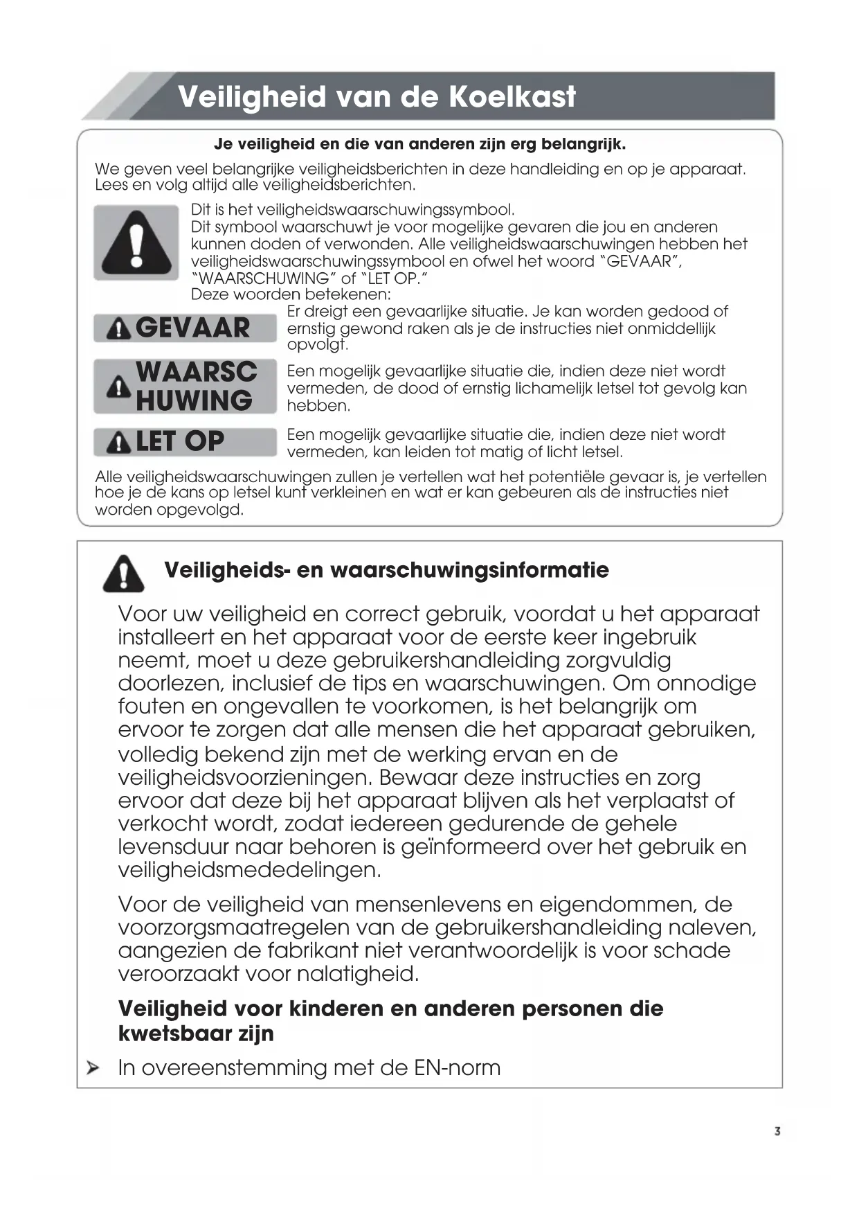 VEILIGHEID VAN DE KOELKAST.......................................................................................... ONDERDELEN EN KENMERKEN.......................................................................................... INSTALLATIEVEREISTEN..................................................................................................... Locatievereisten.......................................................................................................................... Elektrische Vereisten.................................................................................................................... INSTALLATIE-INSTRUCTIES................................................................................................ Uitpakken van de Koelkast......................................................................................................... Installatiepositie............................................................................................................................ Deuren Verwijderen..................................................................................................................... Gebruik van wateropslagbox.................................................................................................... Voltooi de Installatie.................................................................................................................... Koelkast Waterpas Zetten........................................................................................................... Deuren Uitlijnen............................................................................................................................ GEBRUIK VAN DE KOELKAST............................................................................................ Openen en Sluiten van de Deuren........................................................................................... De bediening gebruiken............................................................................................................. Kenmerken................................................................................................................................... Informatie Algemeen Gebruik................................................................................................... KOELKAST ONDERHOUD.................................................................................................. Reinigen....................................................................................................................................... Verlichting.................................................................................................................................... Verzorging bij Vakantie en Vervoer.......................................................................................... Koelkast Opnieuw Installeren/Gebruiken................................................................................. PROBLEEMOPLOSSING.....................................................................................................Je veiligheid en die van anderen zijn erg belangrijk. Veiligheid van de Koelkast We geven veel belangrijke veiligheidsberichten in deze handleiding en op je apparaat. Lees en volg altijd alle veiligheidsberichten. Dit is het veiligheidswaarschuwingssymbool. Dit symbool waarschuwt je voor mogelijke gevaren die jou en anderen kunnen doden of verwonden. Alle veiligheidswaarschuwingen hebben het veiligheidswaarschuwingssymbool en ofwel het woord “GEVAAR”, “WAARSCHUWING” of “LET OP.” Deze woorden betekenen: Er dreigt een gevaarlijke situatie. Je kan worden gedood of ernstig gewond raken als je de instructies niet onmiddellijk opvolgt. GEVAAR WAARSC HUWING LET OP Een mogelijk gevaarlijke situatie die, indien deze niet wordt vermeden, de dood of ernstig lichamelijk letsel tot gevolg kan hebben. Een mogelijk gevaarlijke situatie die, indien deze niet wordt vermeden, kan leiden tot matig of licht letsel. Alle veiligheidswaarschuwingen zullen je vertellen wat het potentiële gevaar is, je vertellen hoe je de kans op letsel kunt verkleinen en wat er kan gebeuren als de instructies niet worden opgevolgd. Veiligheids- en waarschuwingsinformatie Voor uw veiligheid en correct gebruik, voordat u het apparaat installeert en het apparaat voor de eerste keer ingebruik neemt, moet u deze gebruikershandleiding zorgvuldig doorlezen, inclusief de tips en waarschuwingen. Om onnodige fouten en ongevallen te voorkomen, is het belangrijk om ervoor te zorgen dat alle mensen die het apparaat gebruiken, volledig bekend zijn met de werking ervan en de veiligheidsvoorzieningen. Bewaar deze instructies en zorg ervoor dat deze bij het apparaat blijven als het verplaatst of verkocht wordt, zodat iedereen gedurende de gehele levensduur naar behoren is geïnformeerd over het gebruik en veiligheidsmededelingen. Voor de veiligheid van mensenlevens en eigendommen, de voorzorgsmaatregelen van de gebruikershandleiding naleven, aangezien de fabrikant niet verantwoordelijk is voor schade veroorzaakt voor nalatigheid. Veiligheid voor kinderen en anderen personen die kwetsbaar zijn In overeenstemming met de EN-normDit apparaat kan door kinderen van 8 jaar en ouder en personen met verminderde fysieke, sensorische of mentale capaciteiten of gebrek aan ervaring en kennis worden gebruikt als zij op een veilige manier geïnstrueerd zijn over het gebruik van het apparaat en de betrokken gevaren hebben begrepen. Kinderen mogen niet met het apparaat spelen. Reinigings- en onderhoudswerkzaamheden mag niet zonder toezicht door kinderen worden gedaan. Kinderen in de leeftijd van 3 tot 8 mogen in werking zijnde koelende apparaten vullen en leegmaken. In overeenstemming met de IEC-norm Dit apparaat is niet bedoeld voor gebruik door personen (inclusief kinderen) met verminderde lichamelijke, zintuiglijke of geestelijke vermogens, of gebrek aan ervaring en kennis, tenzij ze onder toezicht s