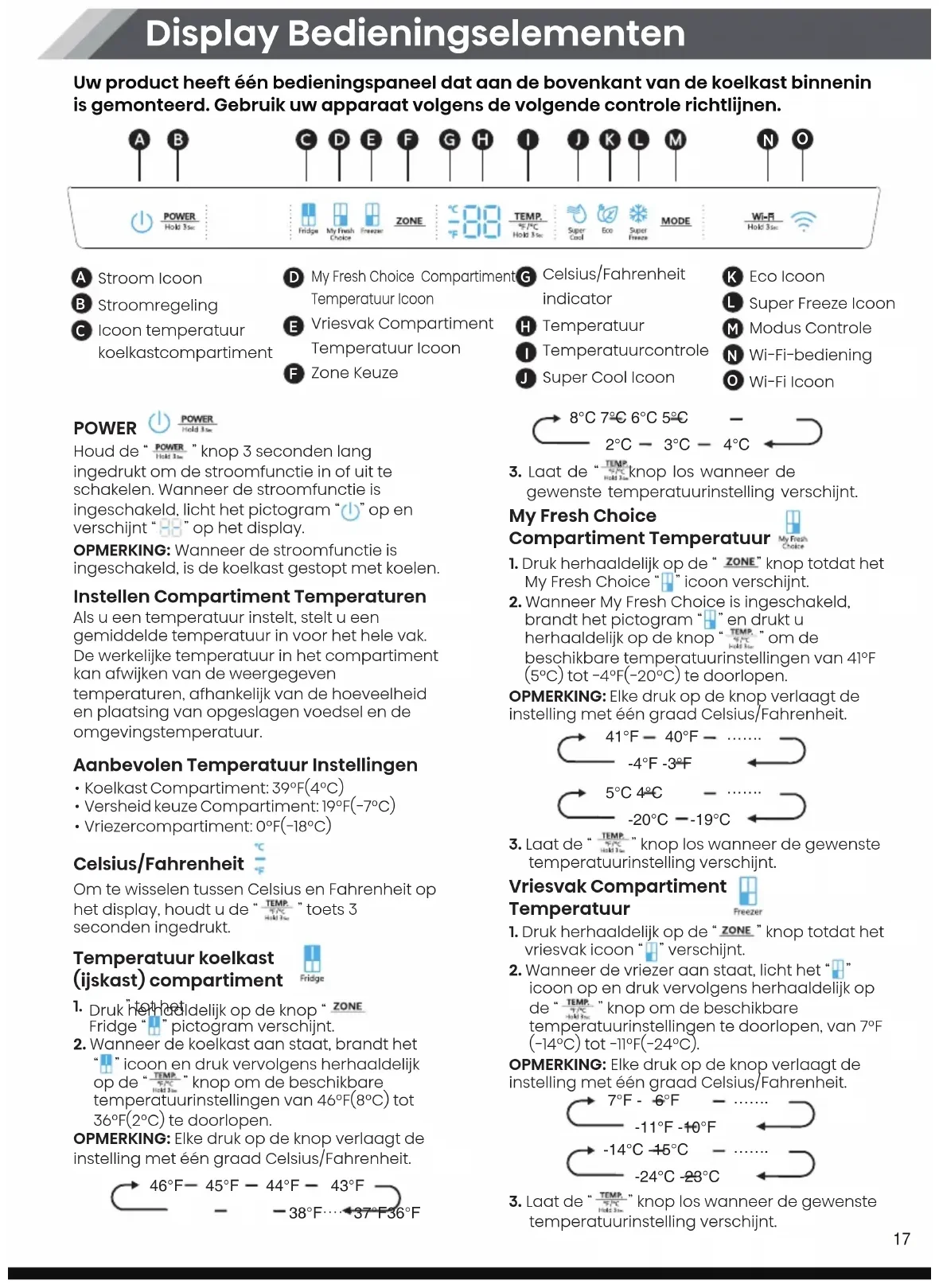 POWER Aanbevolen Temperatuur Instellingen Celsius/Fahrenheit Houd de “ ” knop 3 seconden lang ingedrukt om de stroomfunctie in of uit te schakelen. Wanneer de stroomfunctie is ingeschakeld, licht het pictogram “ ” op en verschijnt “ ” op het display. OPMERKING: Wanneer de stroomfunctie is ingeschakeld, is de koelkast gestopt met koelen. Instellen Compartiment Temperaturen Als u een temperatuur instelt, stelt u een gemiddelde temperatuur in voor het hele vak. De werkelijke temperatuur in het compartiment kan afwijken van de weergegeven temperaturen, afhankelijk van de hoeveelheid en plaatsing van opgeslagen voedsel en de omgevingstemperatuur.