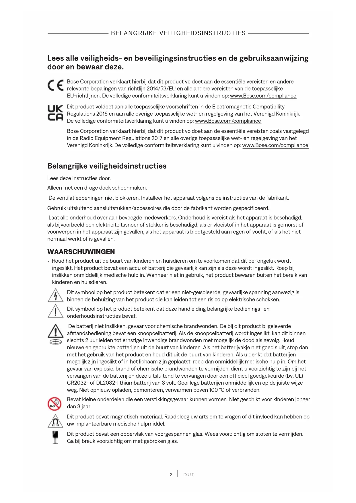 DUT Lees alle veiligheids- en beveiligingsinstructies en de gebruiksaanwijzing door en bewaar deze. Bose Corporation verklaart hierbij dat dit product voldoet aan de essentiële vereisten en andere relevante bepalingen van richtlijn 2014/53/EU en alle andere vereisten van de toepasselijke EU-richtlijnen. De volledige conformiteitsverklaring kunt u vinden op: www.Bose.com/compliancewww.Bose.com/compliance Dit product voldoet aan alle toepasselijke voorschriften in de Electromagnetic Compatibility Regulations 2016 en aan alle overige toepasselijke wet- en regelgeving van het Verenigd Koninkrijk. De volledige conformiteitsverklaring kunt u vinden op: www.Bose.com/compliancewww.Bose.com/compliance Bose Corporation verklaart hierbij dat dit product voldoet aan de essentiële vereisten zoals vastgelegd in de Radio Equipment Regulations 2017 en alle overige toepasselijke wet- en regelgeving van het Verenigd Koninkrijk. De volledige conformiteitsverklaring kunt u vinden op: www.Bose.com/compliancewww.Bose.com/compliance Belangrijke veiligheidsinstructies Lees deze instructies door. Alleen met een droge doek schoonmaken. De ventilatieopeningen niet blokkeren. Installeer het apparaat volgens de instructies van de fabrikant. Gebruik uitsluitend aansluitstukken/accessoires die door de fabrikant worden gespecificeerd. Laat alle onderhoud over aan bevoegde medewerkers. Onderhoud is vereist als het apparaat is beschadigd, als bijvoorbeeld een elektriciteitssnoer of stekker is beschadigd, als er vloeistof in het apparaat is gemorst of voorwerpen in het apparaat zijn gevallen, als het apparaat is blootgesteld aan regen of vocht, of als het niet normaal werkt of is gevallen. WAARSCHUWINGEN
