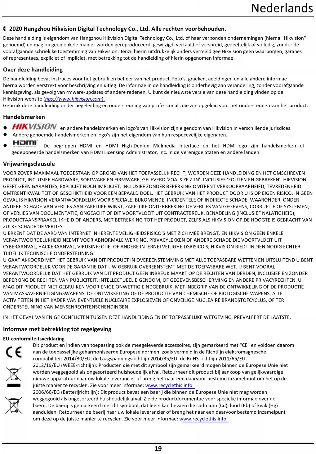 © 2020 Hangzhou Hikvision Digital Technology Co., Ltd. Alle rechten voorbehouden. Deze handleiding is eigendom van Hangzhou Hikvision Digital Technology Co., Ltd. of haar verbonden ondernemingen (hierna "Hikvision" genoemd) en mag op geen enkele manier worden gereproduceerd, gewijzigd, vertaald of verspreid, gedeeltelijk of volledig, zonder de voorafgaande schriftelijke toestemming van Hikvision. Tenzij hierin uitdrukkelijk anders vermeld geeft Hikvision geen waarborgen, garanties of representaties, expliciet of impliciet, met betrekking tot de handleiding of hierin opgenomen informatie. Over deze handleiding De handleiding bevat instructies voor het gebruik en beheer van het product. Foto's, grafieken, afbeeldingen en alle andere informatie hierna worden verstrekt voor beschrijving en uitleg. De informatie in de handleiding is onderhevig aan verandering, zonder voorafgaande kennisgeving, als gevolg van firmware-updates of andere redenen. U kunt de nieuwste versie van deze handleiding vinden op de Hikvision-website (https://www.hikvision.com). Gebruik deze handleiding onder begeleiding en ondersteuning van professionals die zijn opgeleid voor het ondersteunen van het product. Handelsmerken en andere handelsmerken en logo's van Hikvision zijn eigendom van Hikvision in verschillende jurisdicties. Andere genoemde handelsmerken en logo's zijn het eigendom van hun respectievelijke eigenaren. De begrippen HDMI en HDMI High-Definition Multimedia Interface en het HDMI-logo zijn handelsmerken of gedeponeerde handelsmerken van HDMI Licensing Administrator, Inc. in de Verenigde Staten en andere landen. Vrijwaringsclausule VOOR ZOVER MAXIMAAL TOEGESTAAN OP GROND VAN HET TOEPASSELIJK RECHT, WORDEN DEZE HANDLEIDING EN HET OMSCHREVEN PRODUCT, INCLUSIEF HARDWARE, SOFTWARE EN FIRMWARE, GELEVERD ‘ZOALS ZE ZIJN’, INCLUSIEF ‘FOUTEN EN GEBREKEN’. HIKVISION GEEFT GEEN GARANTIES, EXPLICIET NOCH IMPLICIET, INCLUSIEF ZONDER BEPERKING OMTRENT VERKOOPBAARHEIED, TEVREDENHEID OMTRENT KWALITEIT OF GESCHIKTHEID VOOR EEN BEPAALD DOEL. HET GEBRUIK VAN HET PRODUCT DOOR U IS OP EIGEN RISICO. IN GEEN GEVAL IS HIKVISION VERANTWOORDELIJK VOOR SPECIALE, BIJKOMENDE, INCIDENTELE OF INDIRECTE SCHADE, WAARONDER, ONDER ANDERE, SCHADE VAN VERLIES AAN ZAKELIJKE WINST, ZAKELIJKE ONDERBREKING OF VERLIES VAN GEGEVENS, CORRUPTIE OF SYSTEMEN, OF VERLIES VAN DOCUMENTATIE, ONGEACHT OF DIT VOORTVLOEIT UIT CONTRACTBREUK, BENADELING (INCLUSIEF NALATIGHEID), PRODUCTAANSPRAAKELIJKHEID OF ANDERS, MET BETREKKING TOT HET PRODUCT, ZELFS ALS HIKVISION OP DE HOOGTE IS GEBRACHT VAN ZULKE SCHADE OF VERLIES. U ERKENT DAT DE AARD VAN INTERNET INHERENTE VEILIGHEIDSRISICO'S MET ZICH MEE BRENGT, EN HIKVISION GEEN ENKELE VERANTWOORDELIJKHEID NEEMT VOOR ABNORMALE WERKING, PRIVACYLEKKEN OF ANDERE SCHADE DIE VOORTVLOEIT UIT CYBERAANVAL, HACKERAANVAL, VIRUSINFECTIE, OF ANDERE INTERNETVEILIGHEIDSRISICO'S; HIKVISION BIEDT INDIEN NODIG ECHTER TIJDELIJK TECHNISCHE ONDERSTEUNING. U GAAT AKKOORD MET HET GEBRUIK VAN DIT PRODUCT IN OVEREENSTEMMING MET ALLE TOEPASBARE WETTEN EN UITSLUITEND U BENT VERANTWOORDELIJK VOOR DE GARANTIE DAT UW GEBRUIK OVEREENSTEMT MET DE TOEPASBARE WET. U BENT VOORAL VERANTWOORDELIJK DAT HET GEBRUIK VAN DIT PRODUCT GEEN INBREUK MAAKT OP DE RECHTEN VAN DERDEN, INCLUSIEF EN ZONDER BEPERKING DE RECHTEN VAN PUBLICITEIT, INTELLECTUEEL EIGENDOM, OF GEGEVENSBESCHERMING EN ANDERE PRIVACYRECHTEN. U MAG DIT PRODUCT NIET GEBRUIKEN VOOR ENIGE ONWETTIG EINDGEBRUIK, MET INBEGRIP VAN DE ONTWIKKELING OF DE PRODUCTIE VAN MASSAVERNIETIGINGSWAPENS, DE ONTWIKKELING OF DE PRODUCTIE VAN CHEMISCHE OF BIOLOGISCHE WAPENS, ALLE ACTIVITEITEN IN HET KADER VAN EVENTUELE NUCLEAIRE EXPLOSIEVEN OF ONVEILIGE NUCLEAIRE BRANDSTOFCYCLUS, OF TER ONDERSTEUNING VAN MENSENRECHTENSCHENDINGEN. IN HET GEVAL VAN ENIGE CONFLICTEN TUSSEN DEZE HANDLEIDING EN DE TOEPASSELIJKE WETGEVING, PREVALEERT DE LAATSTE. Informatie met betrekking tot regelgeving EU-conformiteitsverklaring