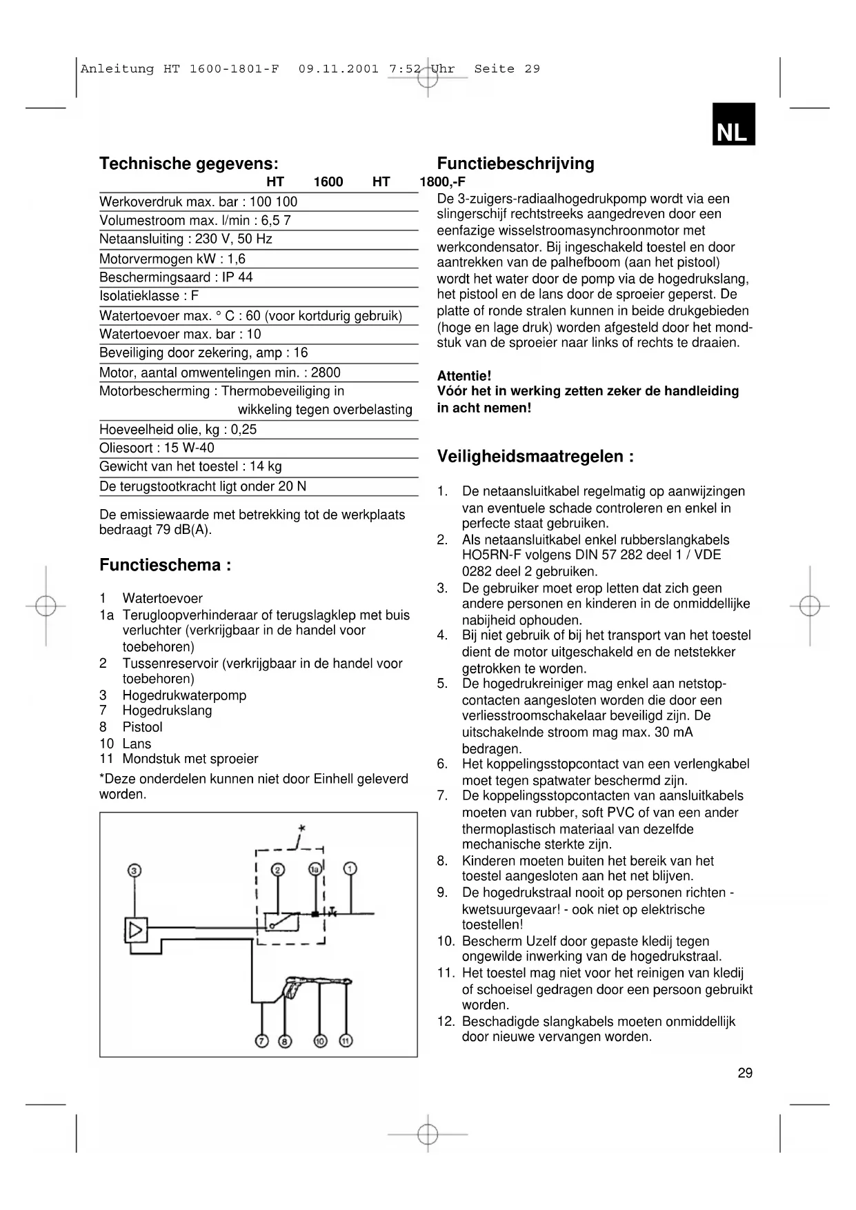 Anleitung HT 1600-1801-F 09.11.2001 7:52 Uhr Seite 28Technische gegevens: HT 1600 HT 1800,-F Werkoverdruk max. bar : 100 100 Volumestroom max. l/min : 6,5 7 Netaansluiting : 230 V, 50 Hz Motorvermogen kW : 1,6 Beschermingsaard : IP 44 Isolatieklasse : F Watertoevoer max. ° C : 60 (voor kortdurig gebruik) Watertoevoer max. bar : 10 Beveiliging door zekering, amp : 16 Motor, aantal omwentelingen min. : 2800 Motorbescherming : Thermobeveiliging in wikkeling tegen overbelasting Hoeveelheid olie, kg : 0,25 Oliesoort : 15 W-40 Gewicht van het toestel : 14 kg De terugstootkracht ligt onder 20 N De emissiewaarde met betrekking tot de werkplaats bedraagt 79 dB(A). Functieschema : 1 Watertoevoer 1a Terugloopverhinderaar of terugslagklep met buis verluchter (verkrijgbaar in de handel voor toebehoren) 2 Tussenreservoir (verkrijgbaar in de handel voor toebehoren) 3 Hogedrukwaterpomp 7 Hogedrukslang 8 Pistool 10 Lans 11 Mondstuk met sproeier *Deze onderdelen kunnen niet door Einhell geleverd worden. Functiebeschrijving De 3-zuigers-radiaalhogedrukpomp wordt via een slingerschijf rechtstreeks aangedreven door een eenfazige wisselstroomasynchroonmotor met werkcondensator. Bij ingeschakeld toestel en door aantrekken van de palhefboom (aan het pistool) wordt het water door de pomp via de hogedrukslang, het pistool en de lans door de sproeier geperst. De platte of ronde stralen kunnen in beide drukgebieden (hoge en lage druk) worden afgesteld door het mond- stuk van de sproeier naar links of rechts te draaien. Attentie! Vóór het in werking zetten zeker de handleiding in acht nemen! Veiligheidsmaatregelen :