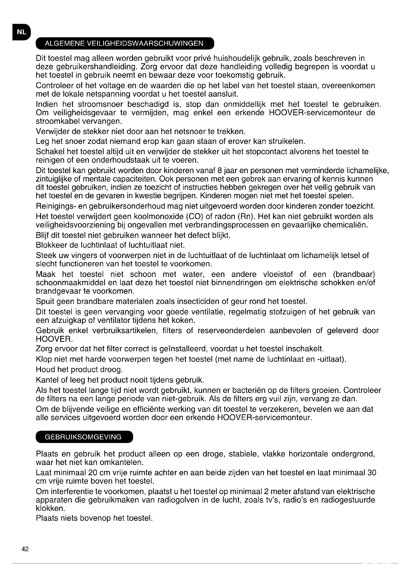 ALGEMENE VEILIGHEIDSWAARSCHUWINGEN Dit toestel mag alleen worden gebruikt voor privé huishoudelijk gebruik, zoals beschreven in deze gebruikershandleiding. Zorg ervoor dat deze handleiding volledig begrepen is voordat u het toestel in gebruik neemt en bewaar deze voor toekomstig gebruik. Controleer of het voltage en de waarden die op het label van het toestel staan, overeenkomen met de lokale netspanning voordat u het toestel aansluit. Indien het stroomsnoer beschadigd is, stop dan onmiddellijk met het toestel te gebruiken. Om veiligheidsgevaar te vermijden, mag enkel een erkende HOOVER-servicemonteur de stroomkabel vervangen. Verwijder de stekker niet door aan het netsnoer te trekken. Leg het snoer zodat niemand erop kan gaan staan of erover kan struikelen. Schakel het toestel altijd uit en verwijder de stekker uit het stopcontact alvorens het toestel te reinigen of een onderhoudstaak uit te voeren. Dit toestel kan gebruikt worden door kinderen vanaf 8 jaar en personen met verminderde lichamelijke, zintuiglijke of mentale capaciteiten. Ook personen met een gebrek aan ervaring of kennis kunnen dit toestel gebruiken, indien ze toezicht of instructies hebben gekregen over het veilig gebruik van het toestel en de gevaren in kwestie begrijpen. Kinderen mogen niet met het toestel spelen. Reinigings- en gebruikersonderhoud mag niet uitgevoerd worden door kinderen zonder toezicht. Het toestel verwijdert geen koolmonoxide (CO) of radon (Rn). Het kan niet gebruikt worden als veiligheidsvoorziening bij ongevallen met verbrandingsprocessen en gevaarlijke chemicaliën. Blijf dit toestel niet gebruiken wanneer het defect blijkt. Blokkeer de luchtinlaat of luchtuitlaat niet. Steek uw vingers of voorwerpen niet in de luchtuitlaat of de luchtinlaat om lichamelijk letsel of slecht functioneren van het toestel te voorkomen. Maak het toestel niet schoon met water, een andere vloeistof of een (brandbaar) schoonmaakmiddel en laat deze het toestel niet binnendringen om elektrische schokken en/of brandgevaar te voorkomen. Spuit geen brandbare materialen zoals insecticiden of geur rond het toestel. Dit toestel is geen vervanging voor goede ventilatie, regelmatig stofzuigen of het gebruik van een afzuigkap of ventilator tijdens het koken. Gebruik enkel verbruiksartikelen, lters of reserveonderdelen aanbevolen of geleverd door HOOVER. Zorg ervoor dat het lter correct is geïnstalleerd, voordat u het toestel inschakelt. Klop niet met harde voorwerpen tegen het toestel (met name de luchtinlaat en -uitlaat). Houd het product droog. Kantel of leeg het product nooit tijdens gebruik. Als het toestel lange tijd niet wordt gebruikt, kunnen er bacteriën op de lters groeien. Controleer de lters na een lange periode van niet-gebruik. Als de lters erg vuil zijn, vervang ze dan. Om de blijvende veilige en efciënte werking van dit toestel te verzekeren, bevelen we aan dat alle services uitgevoerd worden door een erkende HOOVER-servicemonteur. GEBRUIKSOMGEVING Plaats en gebruik het product alleen op een droge, stabiele, vlakke horizontale ondergrond, waar het niet kan omkantelen. Laat minimaal 20 cm vrije ruimte achter en aan beide zijden van het toestel en laat minimaal 30 cm vrije ruimte boven het toestel. Om interferentie te voorkomen, plaatst u het toestel op minimaal 2 meter afstand van elektrische apparaten die gebruikmaken van radiogolven in de lucht, zoals tv’s, radio’s en radiogestuurde klokken. Plaats niets bovenop het toestel.43