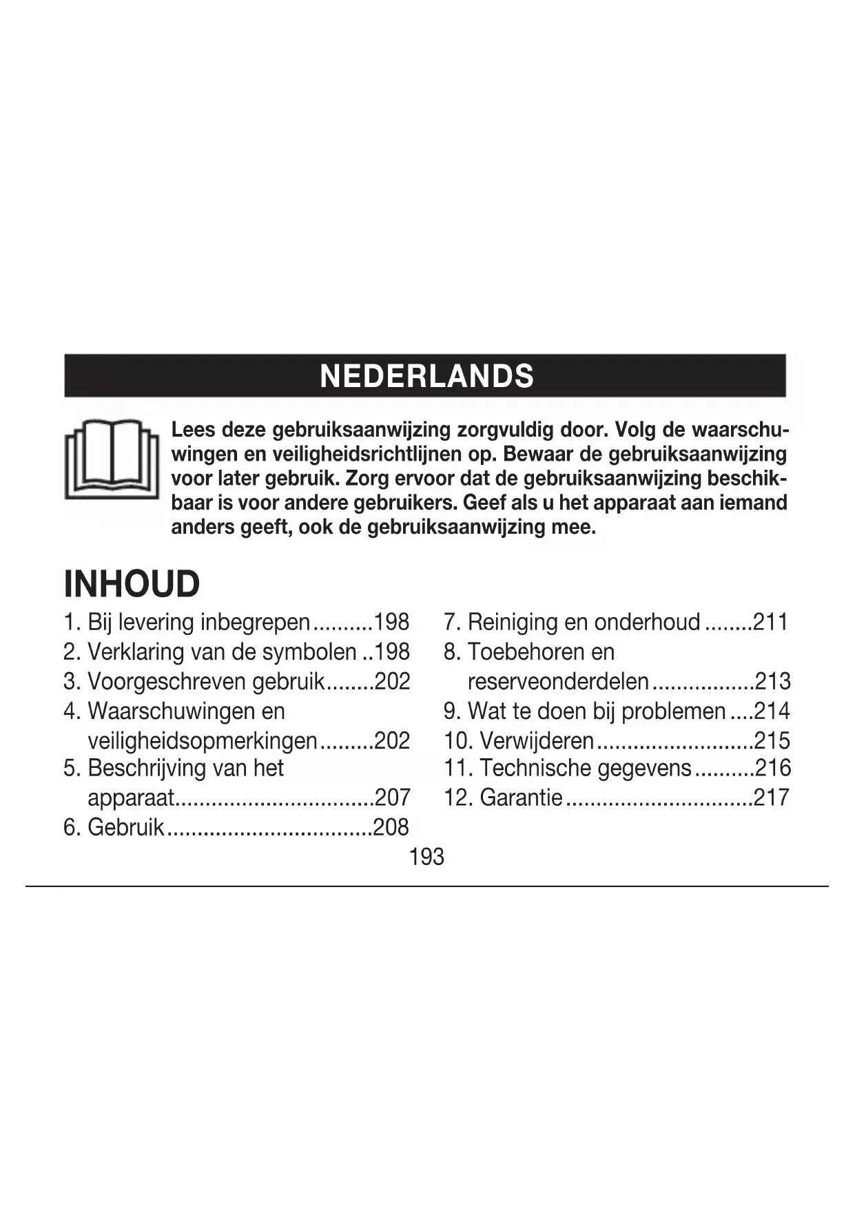 Szczegółowe informacje na temat gwarancji iwarunków gwarancji znajdują się wzałączo- nej ulotce gwarancyjnej. Zastrzega się prawo do pomyłek izmian193 Lees deze gebruiksaanwijzing zorgvuldig door. Volg de waarschu- wingen en veiligheidsrichtlijnen op. Bewaar de gebruiksaanwijzing voor later gebruik. Zorg ervoor dat de gebruiksaanwijzing beschik- baar is voor andere gebruikers. Geef als u het apparaat aan iemand anders geeft, ook de gebruiksaanwijzing mee.