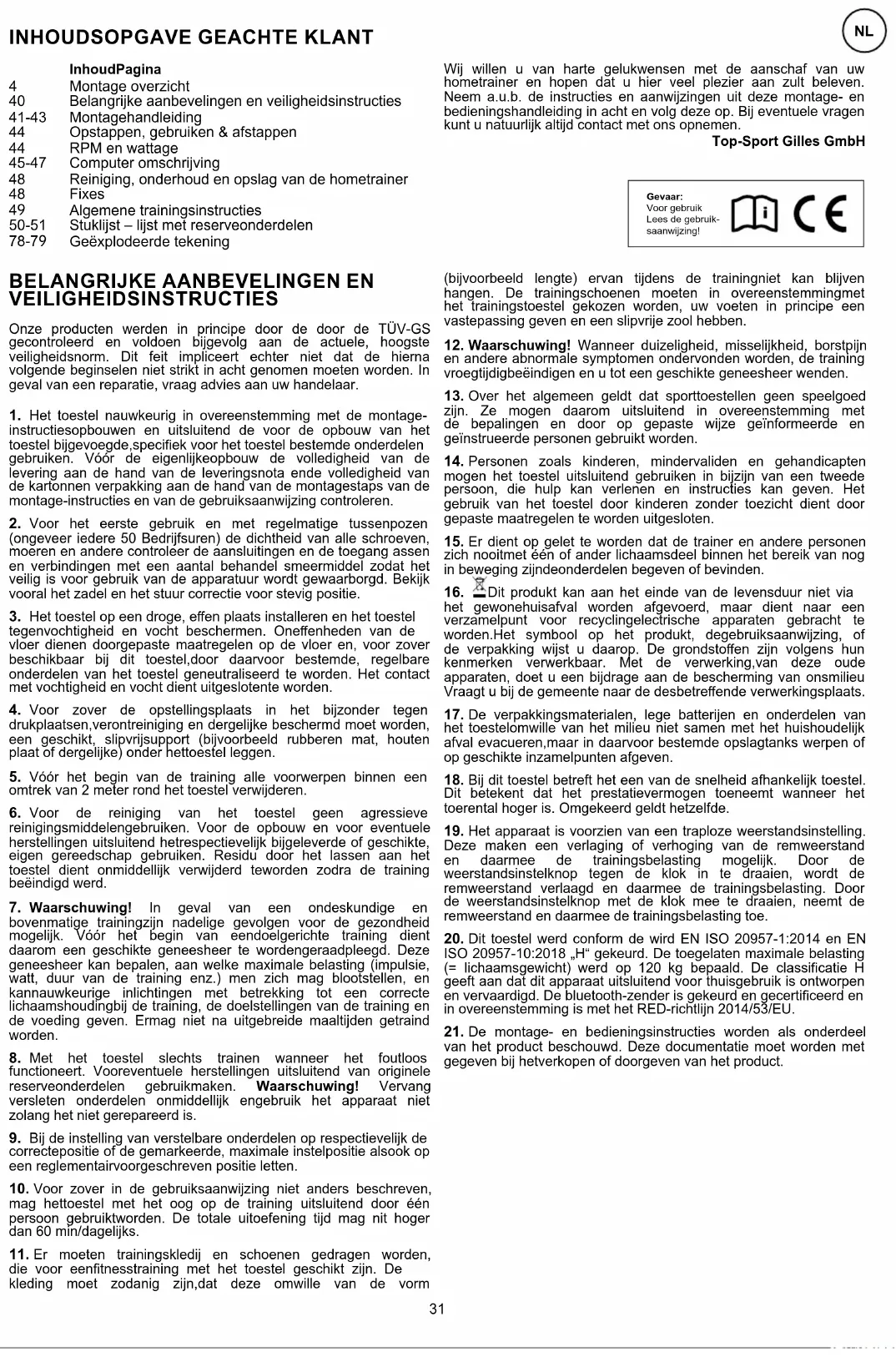 Wij willen u van harte gelukwensen met de aanschaf van uw hometrainer en hopen dat u hier veel plezier aan zult beleven. Neem a.u.b. de instructies en aanwijzingen uit deze montage- en bedieningshandleiding in acht en volg deze op. Bij eventuele vragen kunt u natuurlijk altijd contact met ons opnemen. Top-Sport Gilles GmbH InhoudPagina Gevaar: Voor gebruik Lees de gebruik- saanwijzing!