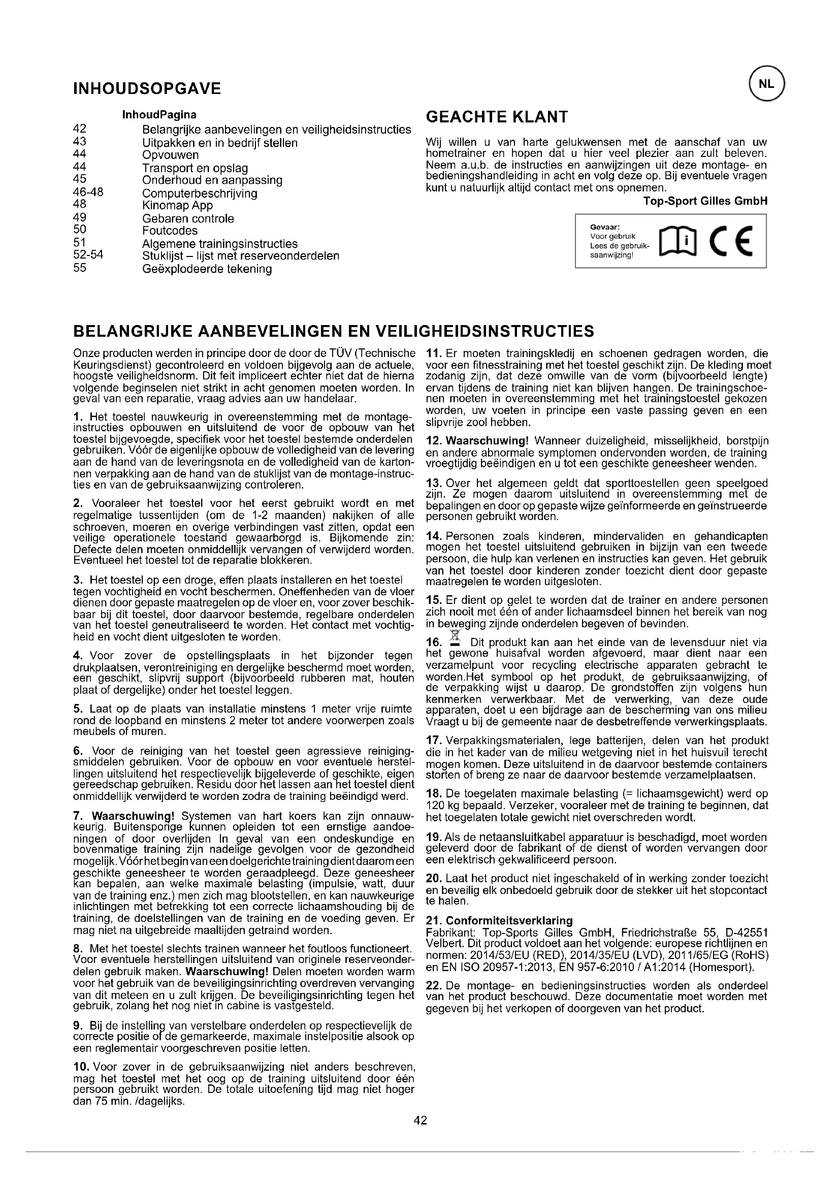 INHOUDSOPGAVE GEACHTE KLANT Wij willen u van harte gelukwensen met de aanschaf van uw hometrainer en hopen dat u hier veel plezier aan zult beleven. Neem a.u.b. de instructies en aanwijzingen uit deze montage- en bedieningshandleiding in acht en volg deze op. Bij eventuele vragen kunt u natuurlijk altijd contact met ons opnemen. Top-Sport Gilles GmbH InhoudPagina Gevaar: Voor gebruik Lees de gebruik- saanwijzing!