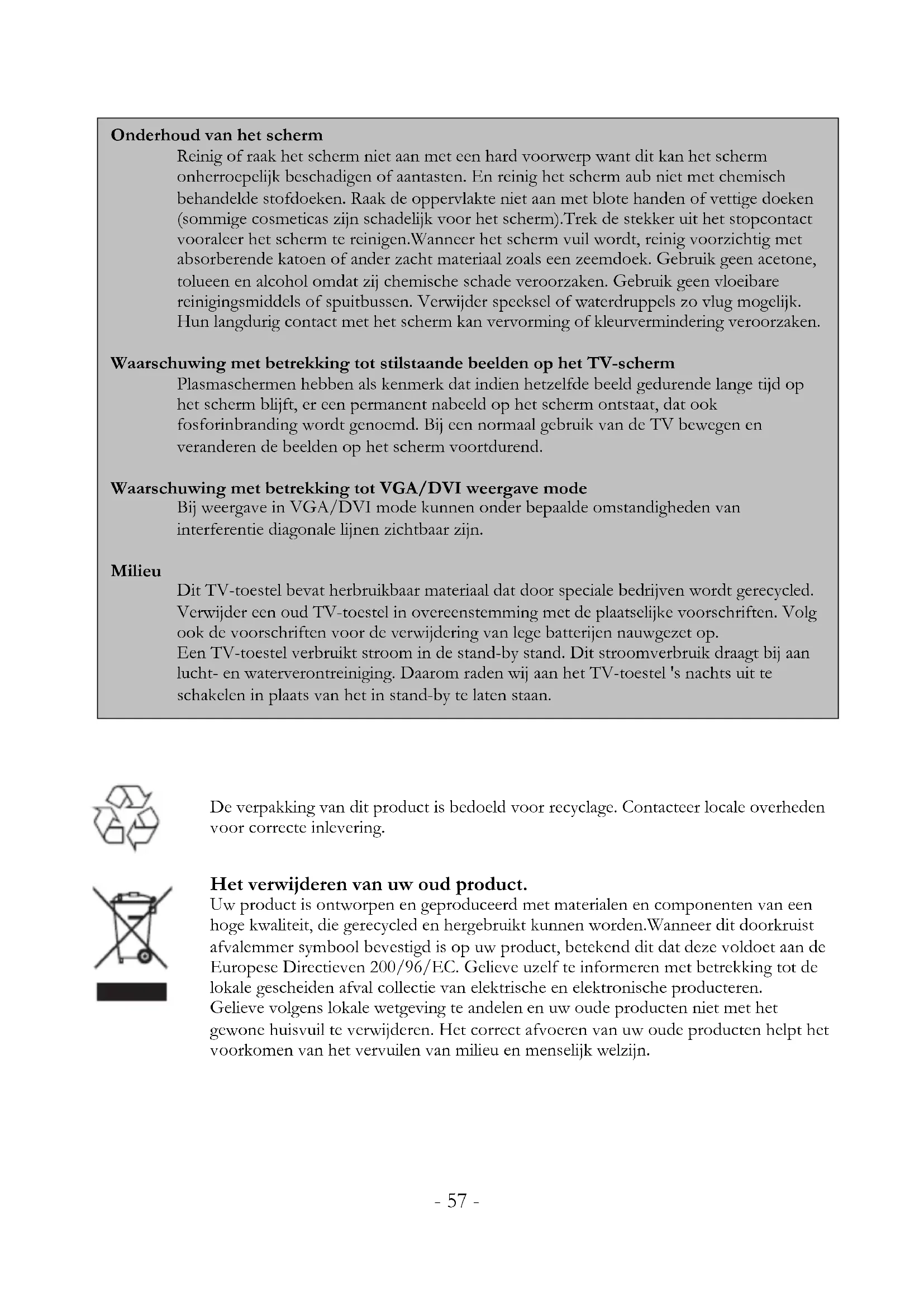- 55 -- 56 -Onderhoud van het scherm Reinig of raak het scherm niet aan met een hard voorwerp want dit kan het scherm onherroepelijk beschadigen of aantasten. En reinig het scherm aub niet met chemisch behandelde stofdoeken. Raak de oppervlakte niet aan met blote handen of vettige doeken (sommige cosmeticas zijn schadelijk voor het scherm).Trek de stekker uit het stopcontact vooraleer het scherm te reinigen.Wanneer het scherm vuil wordt, reinig voorzichtig met absorberende katoen of ander zacht materiaal zoals een zeemdoek. Gebruik geen acetone, tolueen en alcohol omdat zij chemische schade veroorzaken. Gebruik geen vloeibare reinigingsmiddels of spuitbussen. Verwijder speeksel of waterdruppels zo vlug mogelijk. Hun langdurig contact met het scherm kan vervorming of kleurvermindering veroorzaken. Waarschuwing met betrekking tot stilstaande beelden op het TV-scherm Plasmaschermen hebben als kenmerk dat indien hetzelfde beeld gedurende lange tijd op het scherm blijft, er een permanent nabeeld op het scherm ontstaat, dat ook fosforinbranding wordt genoemd. Bij een normaal gebruik van de TV bewegen en veranderen de beelden op het scherm voortdurend. Waarschuwing met betrekking tot VGA/DVI weergave mode Bij weergave in VGA/DVI mode kunnen onder bepaalde omstandigheden van interferentie diagonale lijnen zichtbaar zijn. Milieu Dit TV-toestel bevat herbruikbaar materiaal dat door speciale bedrijven wordt gerecycled. Verwijder een oud TV-toestel in overeenstemming met de plaatselijke voorschriften. Volg ook de voorschriften voor de verwijdering van lege batterijen nauwgezet op. Een TV-toestel verbruikt stroom in de stand-by stand. Dit stroomverbruik draagt bij aan lucht- en waterverontreiniging. Daarom raden wij aan het TV-toestel 's nachts uit te schakelen in plaats van het in stand-by te laten staan.