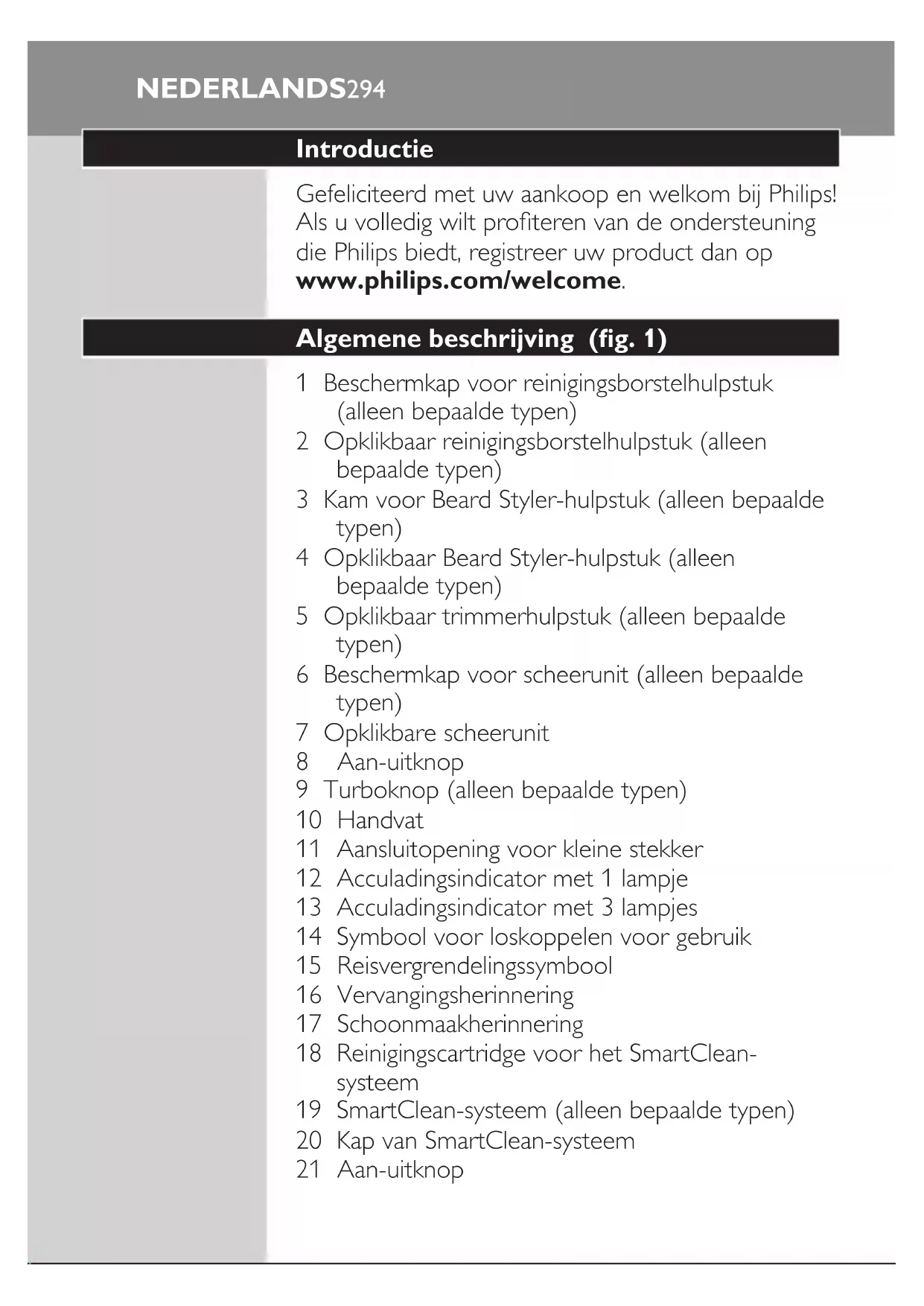 NEDERLANDS 3071 Trek de kam van het hulpstuk. Opmerking: Pak de kam in het midden beet om deze van het hulpstuk te trekken. Trek niet aan de zijkanten van de kam. 2 Schakel het apparaat in. 3 U kunt nu de contouren van uw baard, snor, bakkebaarden of neklijn bijwerken door de styler met lichte druk naar beneden te bewegen terwijl u hem loodrecht op de huid houdt. 4 Maak het hulpstuk na gebruik schoon (zie hoofdstuk ‘Schoonmaken en onderhoud’). Het reinigingsborstelhulpstuk gebruiken Gebruik het draaiende reinigingsborstelhulpstuk in combinatie met uw dagelijkse reinigingscrème. Het reinigingsborstelhulpstuk verwijdert vet en vuil en geeft u een gezonde en schone huid. 1 Plaats het nokje van het hulpstuk in de sleuf aan de bovenkant van het apparaat. Druk het hulpstuk vervolgens naar beneden op het apparaat (‘klik’). 2 Bevochtig het hulpstuk met water. Gebruik het apparaat niet met een droge opzetborstel, dit kan huidirritatie veroorzaken. Tip: Gebruik het hulpstuk voordat u gaat scheren voor eenvoudiger scheren en een hygiënischer scheerresultaat. NEDERLANDS3083 Bevochtig uw gezicht met water en breng een reinigingsmiddel aan op uw gezicht. 4 Plaats het hulpstuk op uw rechterwang. 5 Schakel het apparaat in. 6 Beweeg het hulpstuk voorzichtig over uw huid van uw neus richting uw oor. Duw het hulpstuk niet te hard op de huid en zorg ervoor dat de behandeling aangenaam blijft. 7 Na ongeveer 20 seconden kunt u het hulpstuk tegen uw linkerwang houden en dit deel van uw gezicht reinigen. Let op: Reinig het gevoelige gebied rond uw ogen niet. 8 Na ongeveer 20 seconden kunt u het hulpstuk tegen uw voorhoofd houden en dit deel van uw gezicht reinigen. Beweeg het hulpstuk voorzichtig van links naar rechts. Opmerking: We raden u aan om de huid niet overmatig te reinigen; reinig elke zone maximaal 20 seconden. 9 Na de behandeling dient u uw gezicht schoon te spoelen met water en te drogen. Uw gezicht is nu klaar voor de volgende stap van uw dagelijkse huidverzorging. 10 Maak het hulpstuk na gebruik schoon (zie hoofdstuk ‘Schoonmaken en onderhoud’). 20 sec. 20 sec. 20 sec. NEDERLANDS 309Schoonmaken en onderhoud Opmerking: De geleverde accessoires kunnen variëren voor verschillende producten. Op de verpakking staan de accessoires vermeld die zijn meegeleverd met het apparaat. Het scheerapparaat schoonmaken in het SmartClean-systeem (alleen bepaalde typen) Kantel het SmartClean-systeem niet, anders kan het gaan lekken. Opmerking: Houd het SmartClean-systeem vast terwijl u het klaarmaakt voor gebruik. Opmerking: Als u het scheerapparaat één keer per week schoonmaakt in het SmartClean-systeem, gaat de SmartClean-cartridge ongeveer drie maanden mee. Het SmartClean-systeem klaarmaken voor gebruik 1 Steek de kleine stekker in de achterkant van het SmartClean-systeem. 2 Steek de adapter in het stopcontact. 3 Druk op de knop op de zijkant van het SmartClean-systeem en til het bovenste deel van het SmartClean-systeem omhoog. 4 Trek het zegel van de reinigingscartridge.