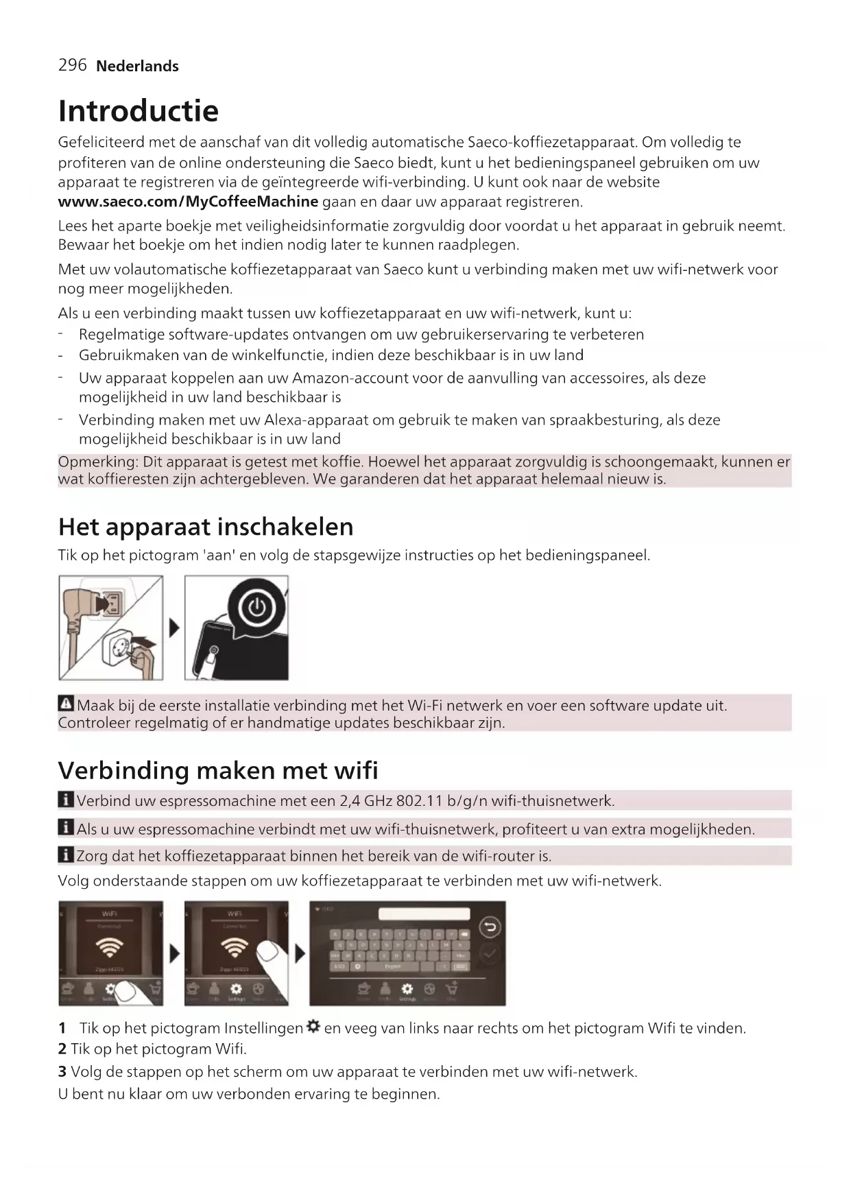Verbinding maken met uw Alexa-apparaat om gebruik te maken van spraakbesturing, als deze mogelijkheid beschikbaar is in uw land Opmerking: Dit apparaat is getest met koffie. Hoewel het apparaat zorgvuldig is schoongemaakt, kunnen er wat koffieresten zijn achtergebleven. We garanderen dat het apparaat helemaal nieuw is. Het apparaat inschakelen Tik op het pictogram 'aan' en volg de stapsgewijze instructies op het bedieningspaneel. Maak bij de eerste installatie verbinding met het Wi-Fi netwerk en voer een software update uit. Controleer regelmatig of er handmatige updates beschikbaar zijn. Verbinding maken met wifi Verbind uw espressomachine met een 2,4 GHz 802.11 b/g/n wifi-thuisnetwerk. Als u uw espressomachine verbindt met uw wifi-thuisnetwerk, profiteert u van extra mogelijkheden. Zorg dat het koffiezetapparaat binnen het bereik van de wifi-router is. Volg onderstaande stappen om uw koffiezetapparaat te verbinden met uw wifi-netwerk. 1 Tik op het pictogram Instellingen en veeg van links naar rechts om het pictogram Wifi te vinden. 2 Tik op het pictogram Wifi. 3 Volg de stappen op het scherm om uw apparaat te verbinden met uw wifi-netwerk. U bent nu klaar om uw verbonden ervaring te beginnen.297 Nederlands Het apparaat voert de automatische spoelcyclus uit wanneer het apparaat via spraakbesturing wordt in- en uitgeschakeld en wanneer het apparaat wordt uitgeschakeld na een bepaalde tijd van inactiviteit. Zorg ervoor dat de omgeving rond het apparaat veilig is. Speciale functies Speciale functie Doel Met CoffeeMaestro kunt u uw koffie personaliseren door een vooraf ingesteld smaakprofiel (Delicato, Intenso, Forte) voor uw drankje te selecteren in plaats van de instellingen zelf te wijzigen. Met de HygieSteam-functie worden automatisch het melksysteem gereinigd en micro-organismen verwijderd: gebruik de functie nadat u cappuccino of andere dranken met melk hebt gezet. De duurzame maalmolen is gemaakt van 100% keramiek en is daardoor uitzonderlijk hard en nauwkeurig. U kunt hem aanpassen aan uw smaak in 12 individuele stappen. Het onderhoudsdashboard biedt u een handig overzicht en informeert u met statusinformatie over diverse zaken, bijvoorbeeld dat de AquaClean bijna op is. Dranken bereiden Algemene stappen Als u een drank wilt bereiden, volgt u een paar eenvoudige stappen. 1 Vul het waterreservoir met kraanwater en vul het bonenreservoir met koffiebonen. 2 Plaats een of twee koppen onder de in hoogte verstelbare koffie-uitloop. Schuif de uitloop naar boven of beneden, afhankelijk van de hoogte van de kop of het glas. 3 Tik op het pictogram Dranken om het menu 'Dranken' te openen. Veeg van links naar rechts en selecteer uw drank door erop te tikken.298 Nederlands