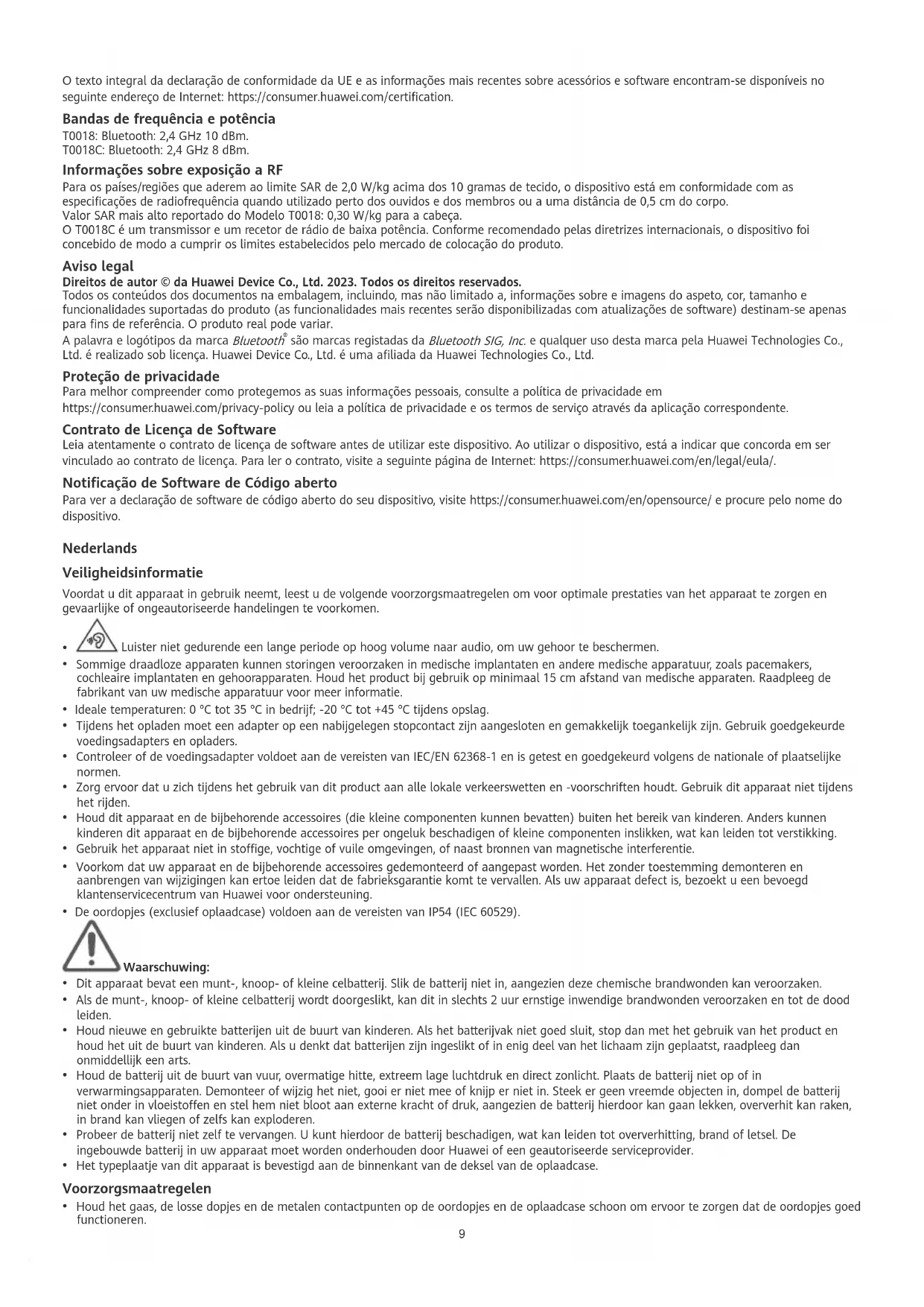 - De rmware van dit apparaat wordt automatisch bijgewerkt wanneer het verbinding maakt met een eerder gekoppeld Honor-apparaat (uitgegeven voor het einde van 2020) of een eerder gekoppeld Huawei-apparaat, en wi of mobiele data ingeschakeld zijn. U kunt automatische rmware- updates uitschakelen in Instellingen. Informatie over afvalverwijdering en recycling Dit symbool op het product, de batterij, de literatuur of de verpakking betekent dat de producten en batterijen aan het einde van hun levensduur naar door de lokale instanties aangewezen afzonderlijke afvalinzamelingspunten moeten worden gebracht. Dit zorgt ervoor dat elektrische en elektronische apparatuur (EEA) wordt gerecycled op een manier die waardevolle materialen behoudt en de volksgezondheid en het milieu beschermt. Neem voor meer informatie contact op met de lokale instanties, met uw verkoper of met de inzamelingsdienst voor huishoudelijk afval. U kunt ook een kijkje nemen op de website https://consumer.huawei.com/en/. Conformiteit met EU-regelgeving Huawei Device Co., Ltd. verklaart hierbij dat dit apparaat T0018/T0018C in naleving is van de volgende Richtlijn RED 2014/53/EU, RoHS 2011/65/EU, EU REACH-voorschrift en de richtlijn inzake batterijen (indien meegeleverd). De volledige tekst van de EU-conformiteitsverklaring en de meest recente informatie over accessoires en software zijn beschikbaar op het volgende internetadres: https://consumer.huawei.com/certication. Frequentiebanden en vermogen T0018: Bluetooth: 2.4 GHz 10 dBm. T0018C: Bluetooth: 2.4 GHz 8 dBm. Informatie over RF-blootstelling Voor de landen/regio’s die de SAR-limiet van X,X 2,0 W/kg over 10 gram weefsel aannemen, voldoet het apparaat aan de RF-specicaties bij gebruik in de buurt van uw oren, ledematen of op een afstand van 0,5 cm van uw lichaam. Hoogste gerapporteerde SAR-waarde van Model T0018: 0,30 W/kg voor het hoofd. T0018C is een radiozender en -ontvanger met een laag vermogen. Zoals aanbevolen door internationale richtlijnen, is het apparaat ontworpen om te voldoen aan de limieten die door de markt waarin het apparaat wordt geplaatst, zijn vastgelegd. Juridische kennisgeving Copyright © Huawei Device Co., Ltd. 2023. Alle rechten voorbehouden. Alle inhoud in de documenten die in de verpakking zijn meegeleverd, inclusief maar niet beperkt tot informatie over en beschrijvingen van het uiterlijk, de kleur, de grootte en ondersteunde functies van het product (nieuwste functies worden met software-updates meegeleverd) zijn uitsluitend bedoeld als referentie. Het werkelijke product kan variëren. Het woordmerk Bluetooth