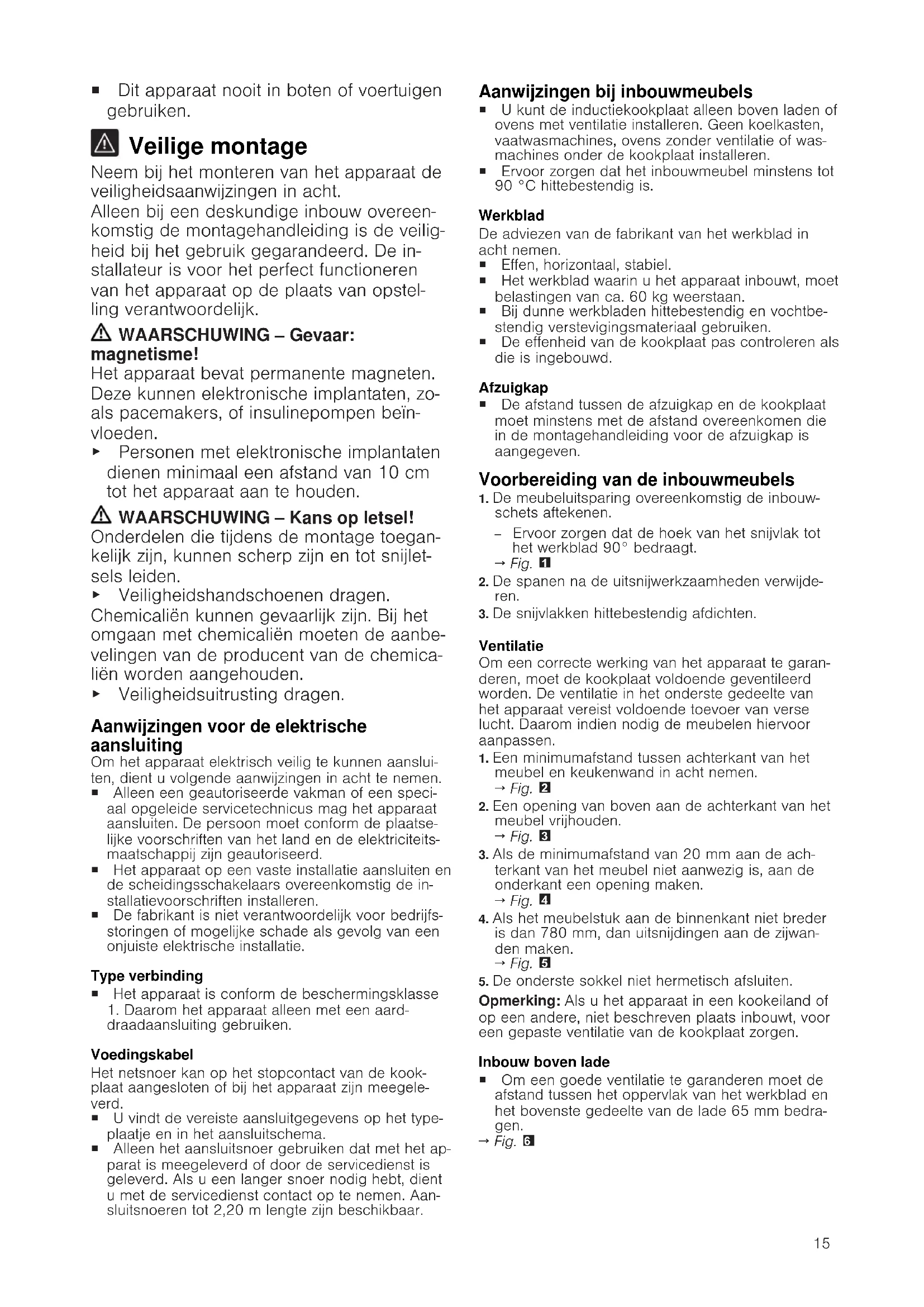 Algemene aanwijzingen ¡ Lees deze gebruiksaanwijzing zorgvuldig door. ¡ Alleen een geautoriseerde vakman mag het apparaat aansluiten. ¡ Een ondeskundige installatie, opening van het apparaat, verbinding of montage leidt tot het verlies van de geldigheid van de productgarantie. ¡ Sluit voor aanvang van alle werkzaamhe- den altijd de stroomtoevoer af. ¡ Na de installatie garanderen dat de ge- bruiker geen toegang tot de elektrische componenten heeft.15 ¡ Dit apparaat nooit in boten of voertuigen gebruiken. Veilige montage Neem bij het monteren van het apparaat de veiligheidsaanwijzingen in acht. Alleen bij een deskundige inbouw overeen- komstig de montagehandleiding is de veilig- heid bij het gebruik gegarandeerd. De in- stallateur is voor het perfect functioneren van het apparaat op de plaats van opstel- ling verantwoordelijk. WAARSCHUWING‒Gevaar: magnetisme! Het apparaat bevat permanente magneten. Deze kunnen elektronische implantaten, zo- als pacemakers, of insulinepompen beïn- vloeden. ▶ Personen met elektronische implantaten dienen minimaal een afstand van 10 cm tot het apparaat aan te houden. WAARSCHUWING‒Kans op letsel! Onderdelen die tijdens de montage toegan- kelijk zijn, kunnen scherp zijn en tot snijlet- sels leiden. ▶ Veiligheidshandschoenen dragen. Chemicaliën kunnen gevaarlijk zijn. Bij het omgaan met chemicaliën moeten de aanbe- velingen van de producent van de chemica- liën worden aangehouden. ▶ Veiligheidsuitrusting dragen. Aanwijzingen voor de elektrische aansluiting Om het apparaat elektrisch veilig te kunnen aanslui- ten, dient u volgende aanwijzingen in acht te nemen. ¡ Alleen een geautoriseerde vakman of een speci- aal opgeleide servicetechnicus mag het apparaat aansluiten. De persoon moet conform de plaatse- lijke voorschriften van het land en de elektriciteits- maatschappij zijn geautoriseerd. ¡ Het apparaat op een vaste installatie aansluiten en de scheidingsschakelaars overeenkomstig de in- stallatievoorschriften installeren. ¡ De fabrikant is niet verantwoordelijk voor bedrijfs- storingen of mogelijke schade als gevolg van een onjuiste elektrische installatie. Type verbinding ¡ Het apparaat is conform de beschermingsklasse