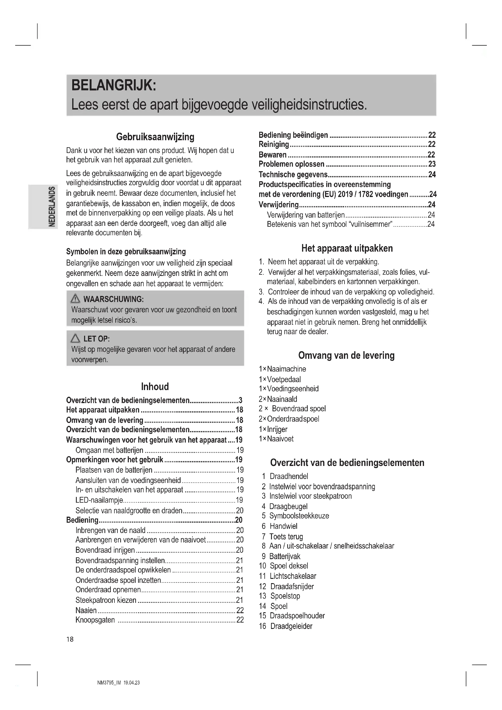 beschadigingen kunnen worden vastgesteld, mag u het apparaat niet in gebruik nemen. Breng het onmiddellijk terug naar de dealer. Omvang van de levering 1 × Naaimachine 1 × Voetpedaal 1 × Voedingseenheid 2 × Naainaald 2 × Bovendraad spoel 2 × Onderdraad spoel 1 × Inrijger 1 × Naaivoet Overzicht van de bedieningselementen 1 Draadhendel 2 Instelwiel voor bovendraadspanning 3 Instelwiel voor steekpatroon 4 Draagbeugel 5 Symboolsteekkeuze 6 Handwiel 7 Toets terug 8 Aan / uit-schakelaar / snelheidsschakelaar 9 Batterijvak 10 Spoel deksel 11 Lichtschakelaar 12 Draadafsnijder 13 Spoelstop 14 Spoel 15 Draadspoelhouder 16 DraadgeleiderNM3795_IM 19.04.23
