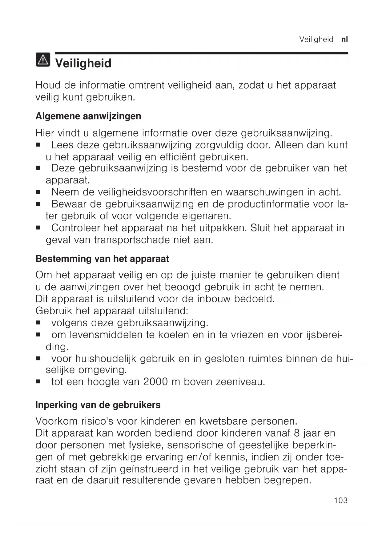 Veiligheid Houd de informatie omtrent veiligheid aan, zodat u het apparaat veilig kunt gebruiken. Algemene aanwijzingen Hier vindt u algemene informatie over deze gebruiksaanwijzing. ¡ Lees deze gebruiksaanwijzing zorgvuldig door. Alleen dan kunt u het apparaat veilig en efficiënt gebruiken. ¡ Deze gebruiksaanwijzing is bestemd voor de gebruiker van het apparaat. ¡ Neem de veiligheidsvoorschriften en waarschuwingen in acht. ¡ Bewaar de gebruiksaanwijzing en de productinformatie voor la- ter gebruik of voor volgende eigenaren. ¡ Controleer het apparaat na het uitpakken. Sluit het apparaat in geval van transportschade niet aan. Bestemming van het apparaat Om het apparaat veilig en op de juiste manier te gebruiken dient u de aanwijzingen over het beoogd gebruik in acht te nemen. Dit apparaat is uitsluitend voor de inbouw bedoeld. Gebruik het apparaat uitsluitend: ¡ volgens deze gebruiksaanwijzing. ¡ om levensmiddelen te koelen en in te vriezen en voor ijsberei- ding. ¡ voor huishoudelijk gebruik en in gesloten ruimtes binnen de hui- selijke omgeving. ¡ tot een hoogte van 2000m boven zeeniveau. Inperking van de gebruikers Voorkom risico's voor kinderen en kwetsbare personen. Dit apparaat kan worden bediend door kinderen vanaf 8 jaar en door personen met fysieke, sensorische of geestelijke beperkin- gen of met gebrekkige ervaring en/of kennis, indien zij onder toe- zicht staan of zijn geïnstrueerd in het veilige gebruik van het appa- raat en de daaruit resulterende gevaren hebben begrepen.nl Veiligheid