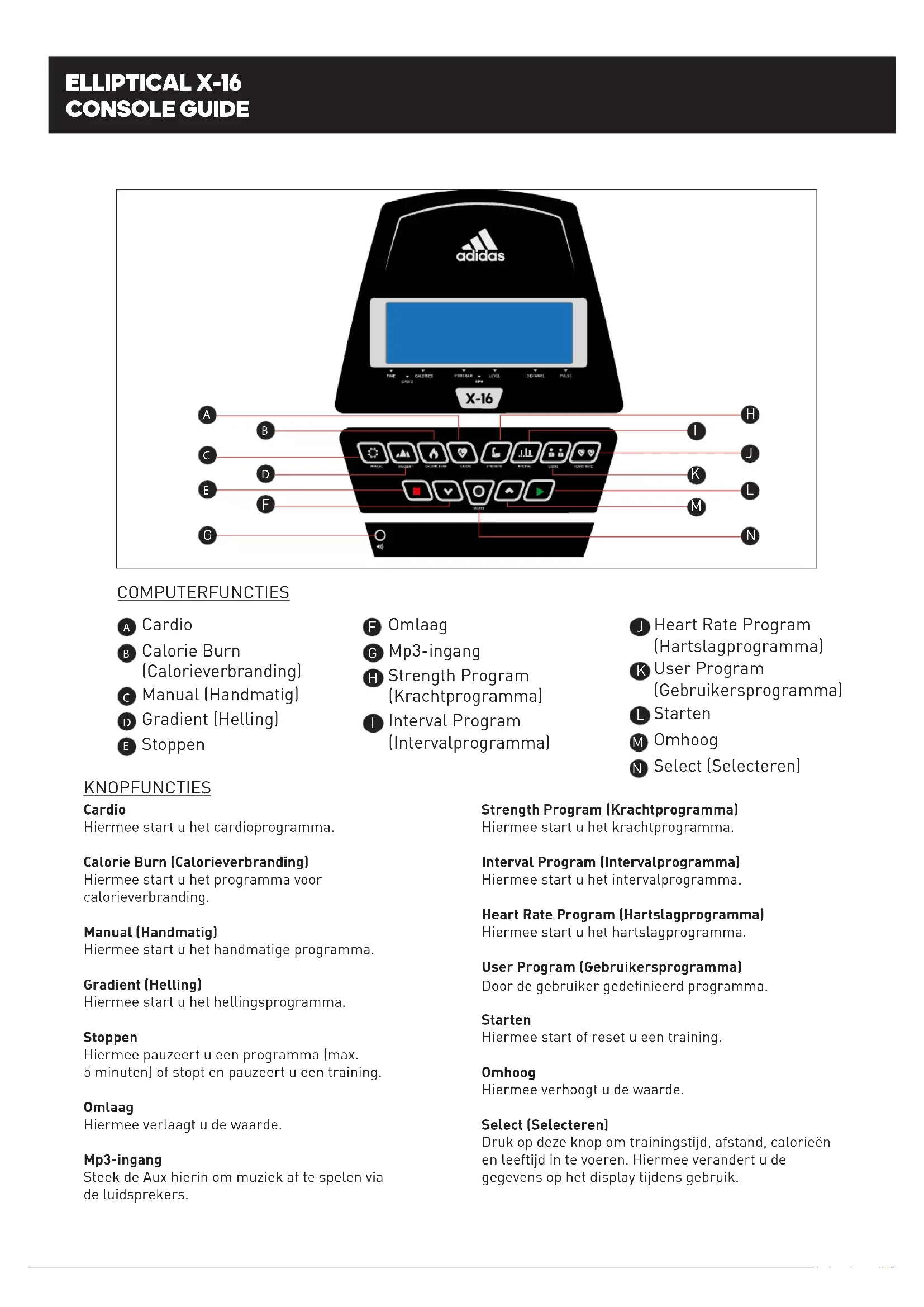 Download de handleiding voor uw Elliptische fiets in PDF-formaat gratis! Vind uw handleiding X-16 - ADIDAS en neem uw elektronisch apparaat weer in handen. Op deze pagina staan alle documenten die nodig zijn voor het gebruik van uw apparaat. X-16 van het merk ADIDAS.