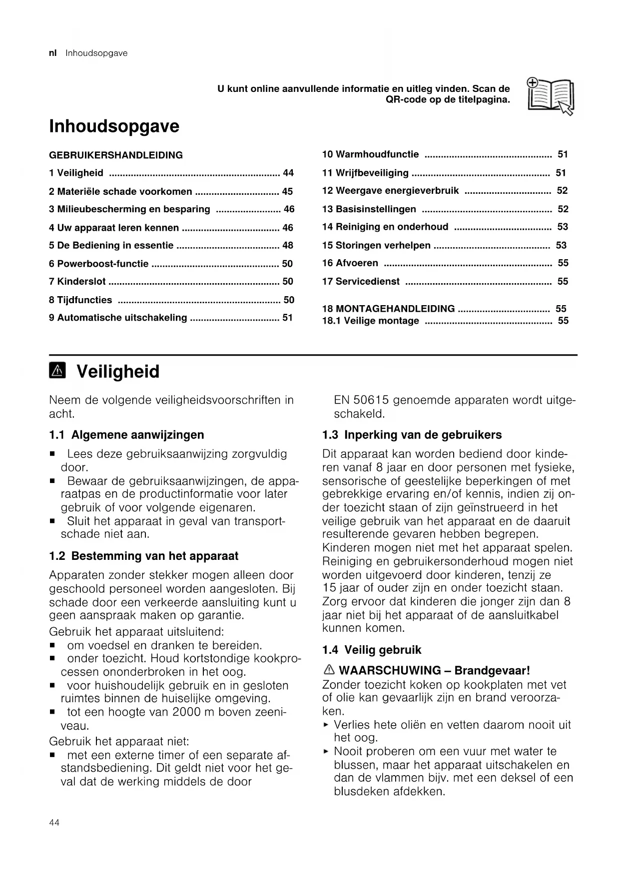 Veiligheid 1 Veiligheid Neem de volgende veiligheidsvoorschriften in acht. 1.1 Algemene aanwijzingen ¡ Lees deze gebruiksaanwijzing zorgvuldig door. ¡ Bewaar de gebruiksaanwijzingen, de appa- raatpas en de productinformatie voor later gebruik of voor volgende eigenaren. ¡ Sluit het apparaat in geval van transport- schade niet aan. 1.2 Bestemming van het apparaat Apparaten zonder stekker mogen alleen door geschoold personeel worden aangesloten. Bij schade door een verkeerde aansluiting kunt u geen aanspraak maken op garantie. Gebruik het apparaat uitsluitend: ¡ om voedsel en dranken te bereiden. ¡ onder toezicht. Houd kortstondige kookpro- cessen ononderbroken in het oog. ¡ voor huishoudelijk gebruik en in gesloten ruimtes binnen de huiselijke omgeving. ¡ tot een hoogte van 2000m boven zeeni- veau. Gebruik het apparaat niet: ¡ met een externe timer of een separate af- standsbediening. Dit geldt niet voor het ge- val dat de werking middels de door EN50615 genoemde apparaten wordt uitge- schakeld. 1.3 Inperking van de gebruikers Dit apparaat kan worden bediend door kinde- ren vanaf 8 jaar en door personen met fysieke, sensorische of geestelijke beperkingen of met gebrekkige ervaring en/of kennis, indien zij on- der toezicht staan of zijn geïnstrueerd in het veilige gebruik van het apparaat en de daaruit resulterende gevaren hebben begrepen. Kinderen mogen niet met het apparaat spelen. Reiniging en gebruikersonderhoud mogen niet worden uitgevoerd door kinderen, tenzij ze 15jaar of ouder zijn en onder toezicht staan. Zorg ervoor dat kinderen die jonger zijn dan 8 jaar niet bij het apparaat of de aansluitkabel kunnen komen. 1.4 Veilig gebruik WAARSCHUWING‒Brandgevaar! Zonder toezicht koken op kookplaten met vet of olie kan gevaarlijk zijn en brand veroorza- ken. Verlies hete oliën en vetten daarom nooit uit het oog. Nooit proberen om een vuur met water te blussen, maar het apparaat uitschakelen en dan de vlammen bijv. met een deksel of een blusdeken afdekken. 44Materiële schade voorkomen nl Het kookvlak wordt erg heet. Nooit brandbare voorwerpen op het kook- vlak of in de directe omgeving leggen. Nooit voorwerpen op het kookvlak bewaren. Het apparaat wordt heet. Nooit brandbare voorwerpen of spuitbussen bewaren in laden direct onder de kookplaat. Als de kookplaat wordt afgedekt, kan dat on- gelukken veroorzaken, bijvoorbeeld door over- verhitting, in brand vliegen of ontploffende ma- terialen. Dek de kookplaat niet af. Levensmiddelen kunnen vuur vatten. Er moet toezicht worden gehouden op het kookproces. Een korte procedure moet per- manent worden gecontroleerd. WAARSCHUWING‒Kans op brandwon- den! Tijdens het gebruik worden het apparaat en zijn aanraakbare onderdelen heet, vooral een eventueel aanwezig kookplaatframe. Wees voorzichtig om het aanraken van ver- warmingselementen te voorkomen. Kinderen jonger dan 8 jaar moeten uit de buurt worden gehouden. Kookplaatbeschermroosters kunnen tot onge- vallen leiden. Nooit kookplaatbeschermroosters gebruiken. Het apparaat wordt heet tijdens het gebruik. Het apparaat voor het schoonmaken laten afkoelen. De grepen van het kookgerei kunnen tijdens het gebruik heet worden. Als de grepen boven de verwarmingszone komen te liggen, kunnen de grepen bijzonder heet worden. Altijd de volledige verwarmingszone met het kookgereik afdekken. Een pannenlap gebruiken. WAARSCHUWING‒Kans op elektrische schok! Ondeskundige reparaties zijn gevaarlijk. Alleen daarvoor geschoold vakpersoneel mag reparaties aan het apparaat uitvoeren. Er mogen uitsluitend originele reserveonder- delen worden gebruikt voor reparatie van het apparaat. Als het netsnoer van dit apparaat wordt be- schadigd, moet het door geschoold vakper- soneel worden vervangen. Een beschadigd apparaat of een beschadigd netsnoer is gevaarlijk. Nooit een beschadigd apparaat gebruiken. Is het oppervlak gescheurd, dan het appa- raat uitschakelen om een mogelijke elektri- sche schok te vermijden. Hiervoor het appa- raat niet aan de hoofdschakelaar, maar via de zekering in de meterkast uitschakelen. Neem contact op met de klantenservice.