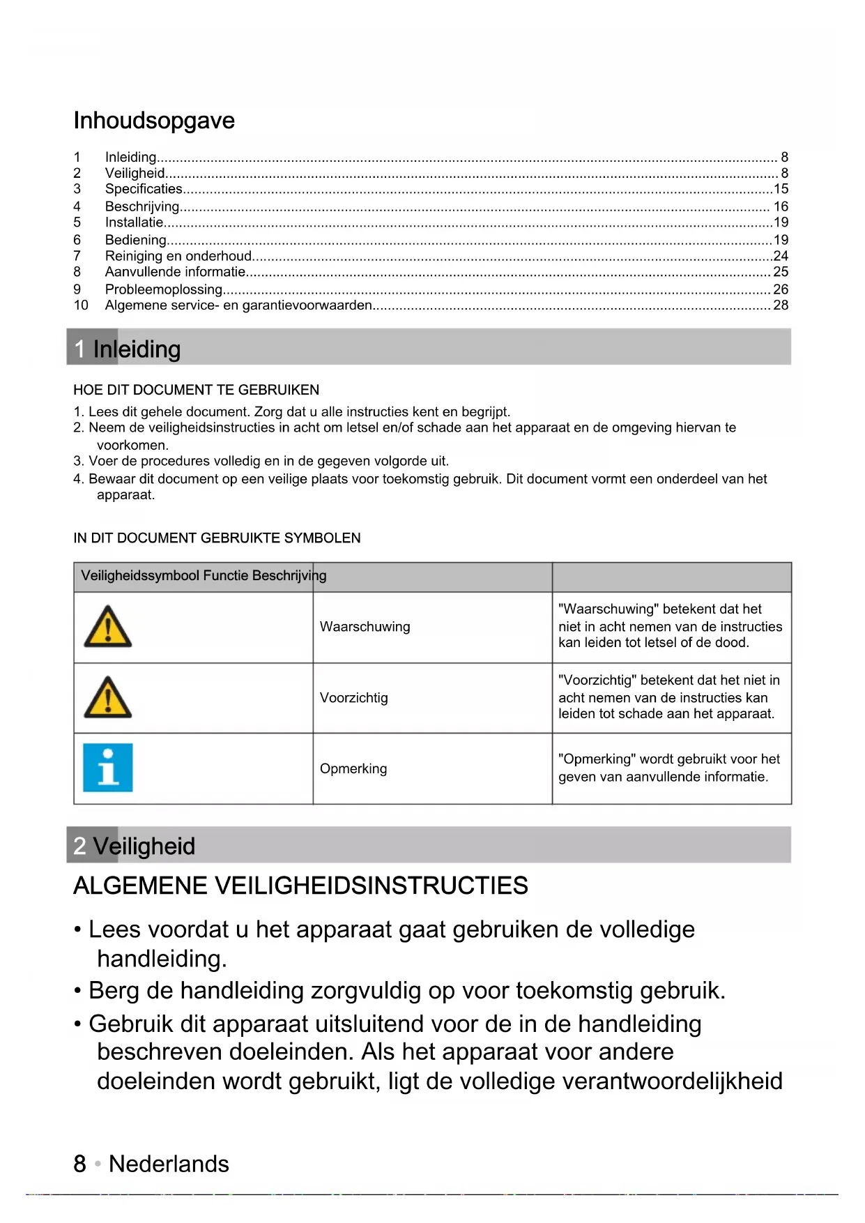 Veiligheidssymbool Functie Beschrijving Waarschuwing "Waarschuwing" betekent dat het niet in acht nemen van de instructies kan leiden tot letsel of de dood. Voorzichtig "Voorzichtig" betekent dat het niet in acht nemen van de instructies kan leiden tot schade aan het apparaat. Opmerking "Opmerking" wordt gebruikt voor het geven van aanvullende informatie. 2 Veiligheid ALGEMENE VEILIGHEIDSINSTRUCTIES