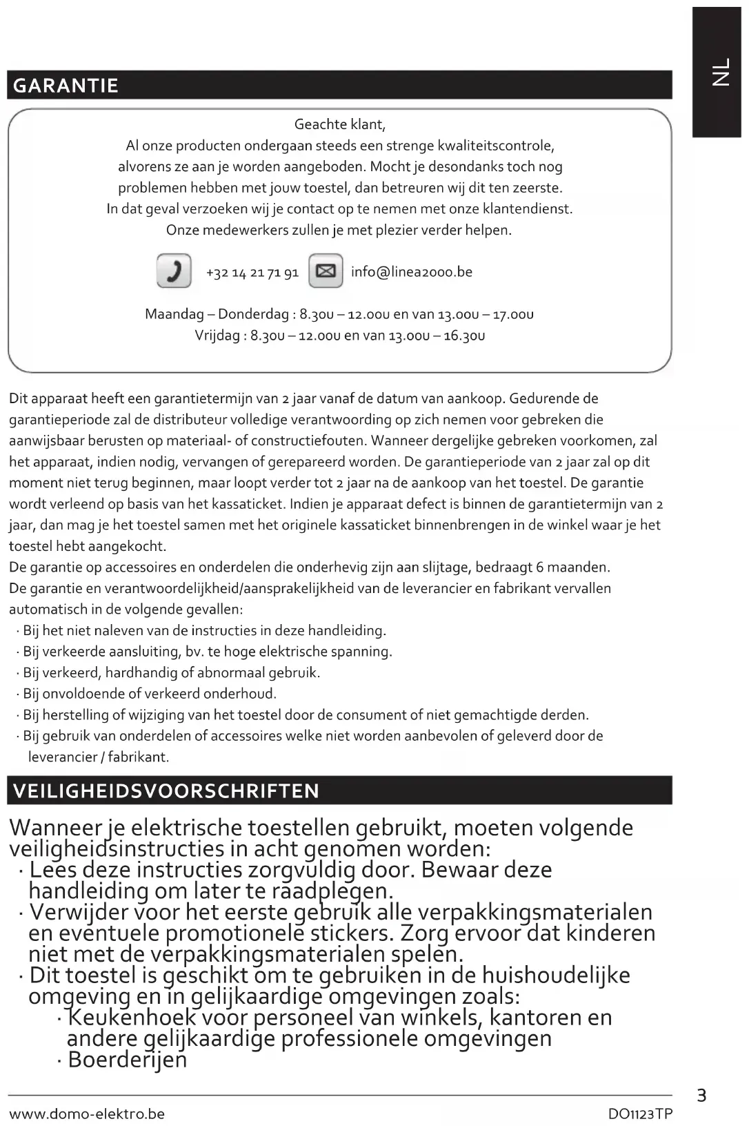 GARANTIE Geachte klant, Al onze producten ondergaan steeds een strenge kwaliteitscontrole, alvorens ze aan je worden aangeboden. Mocht je desondanks toch nog problemen hebben met jouw toestel, dan betreuren wij dit ten zeerste. In dat geval verzoeken wij je contact op te nemen met onze klantendienst. Onze medewerkers zullen je met plezier verder helpen. +32 14 21 71 91 info@linea2000.be Maandag – Donderdag : 8.30u – 12.00u en van 13.00u – 17.00u Vrijdag : 8.30u – 12.00u en van 13.00u – 16.30u Dit apparaat heeft een garantietermijn van 2 jaar vanaf de datum van aankoop. Gedurende de garantieperiode zal de distributeur volledige verantwoording op zich nemen voor gebreken die aanwijsbaar berusten op materiaal- of constructiefouten. Wanneer dergelijke gebreken voorkomen, zal het apparaat, indien nodig, vervangen of gerepareerd worden. De garantieperiode van 2 jaar zal op dit moment niet terug beginnen, maar loopt verder tot 2 jaar na de aankoop van het toestel. De garantie wordt verleend op basis van het kassaticket. Indien je apparaat defect is binnen de garantietermijn van 2 jaar, dan mag je het toestel samen met het originele kassaticket binnenbrengen in de winkel waar je het toestel hebt aangekocht. De garantie op accessoires en onderdelen die onderhevig zijn aan slijtage, bedraagt 6 maanden. De garantie en verantwoordelijkheid/aansprakelijkheid van de leverancier en fabrikant vervallen automatisch in de volgende gevallen: