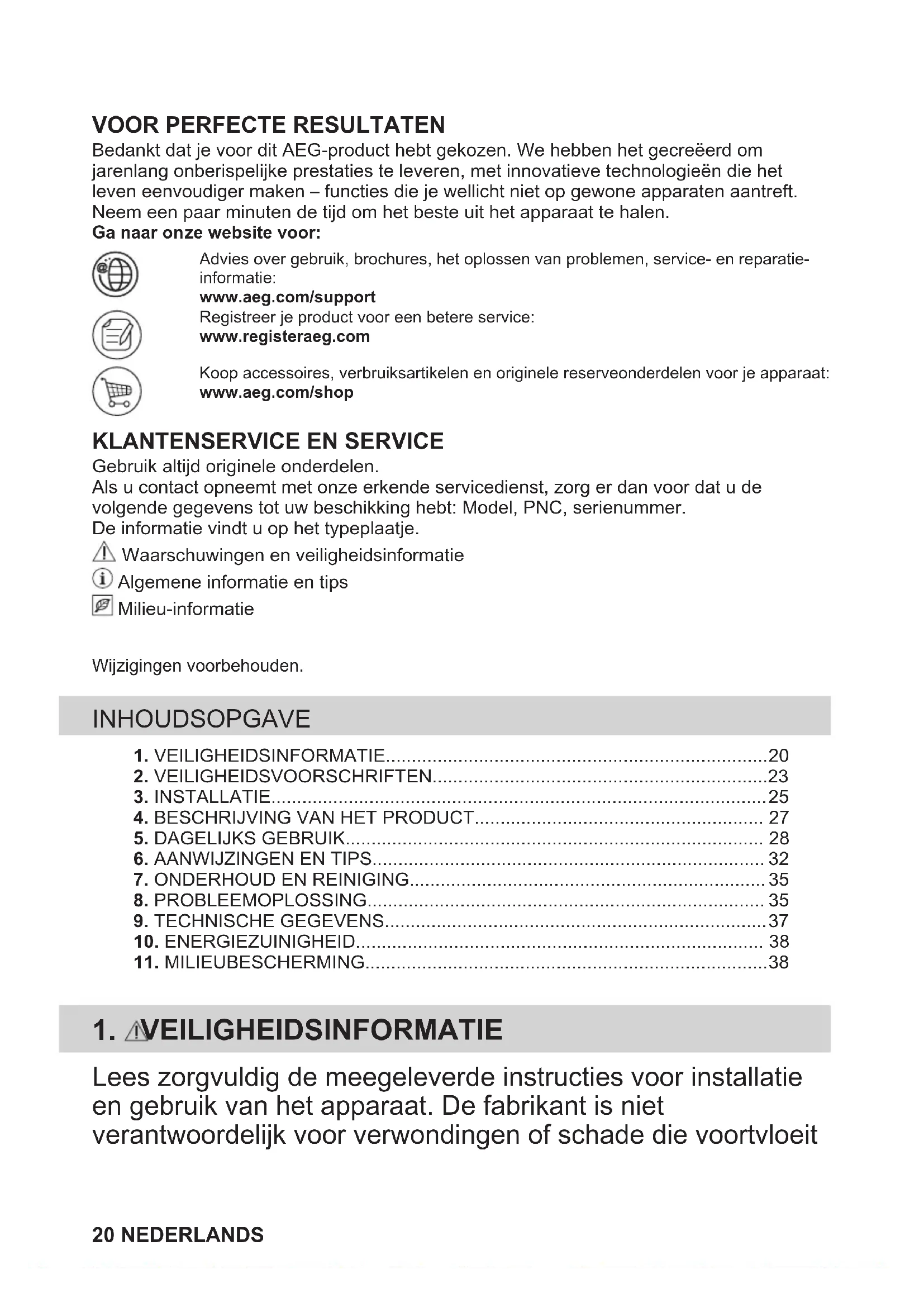 Bedankt dat je voor dit AEG-product hebt gekozen. We hebben het gecreëerd omjarenlang onberispelijke prestaties te leveren, met innovatieve technologieën die hetleven eenvoudiger maken – functies die je wellicht niet op gewone apparaten aantreft.Neem een paar minuten de tijd om het beste uit het apparaat te halen.Ga naar onze website voor:Advies over gebruik, brochures, het oplossen van problemen, service- en reparatie-informatie:www.aeg.com/supportRegistreer je product voor een betere service:www.registeraeg.comKoop accessoires, verbruiksartikelen en originele reserveonderdelen voor je apparaat:www.aeg.com/shop
