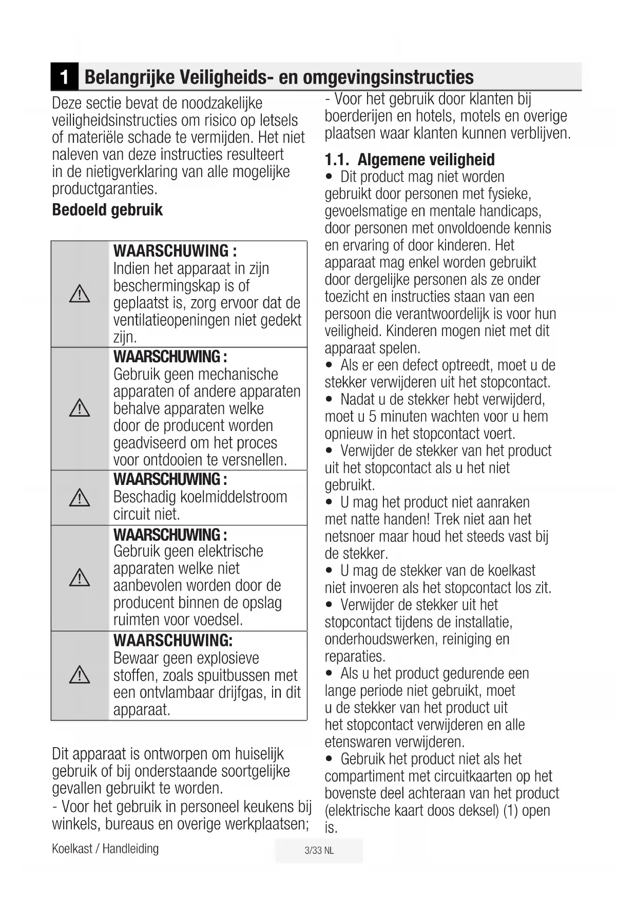 WAARSCHUWING: Bewaar geen explosieve stoffen, zoals spuitbussen met een ontvlambaar drijfgas, in dit apparaat. Dit apparaat is ontworpen om huiselijk gebruik of bij onderstaande soortgelijke gevallen gebruikt te worden. - Voor het gebruik in personeel keukens bij winkels, bureaus en overige werkplaatsen; - Voor het gebruik door klanten bij boerderijen en hotels, motels en overige plaatsen waar klanten kunnen verblijven. 1.1. Algemene veiligheid