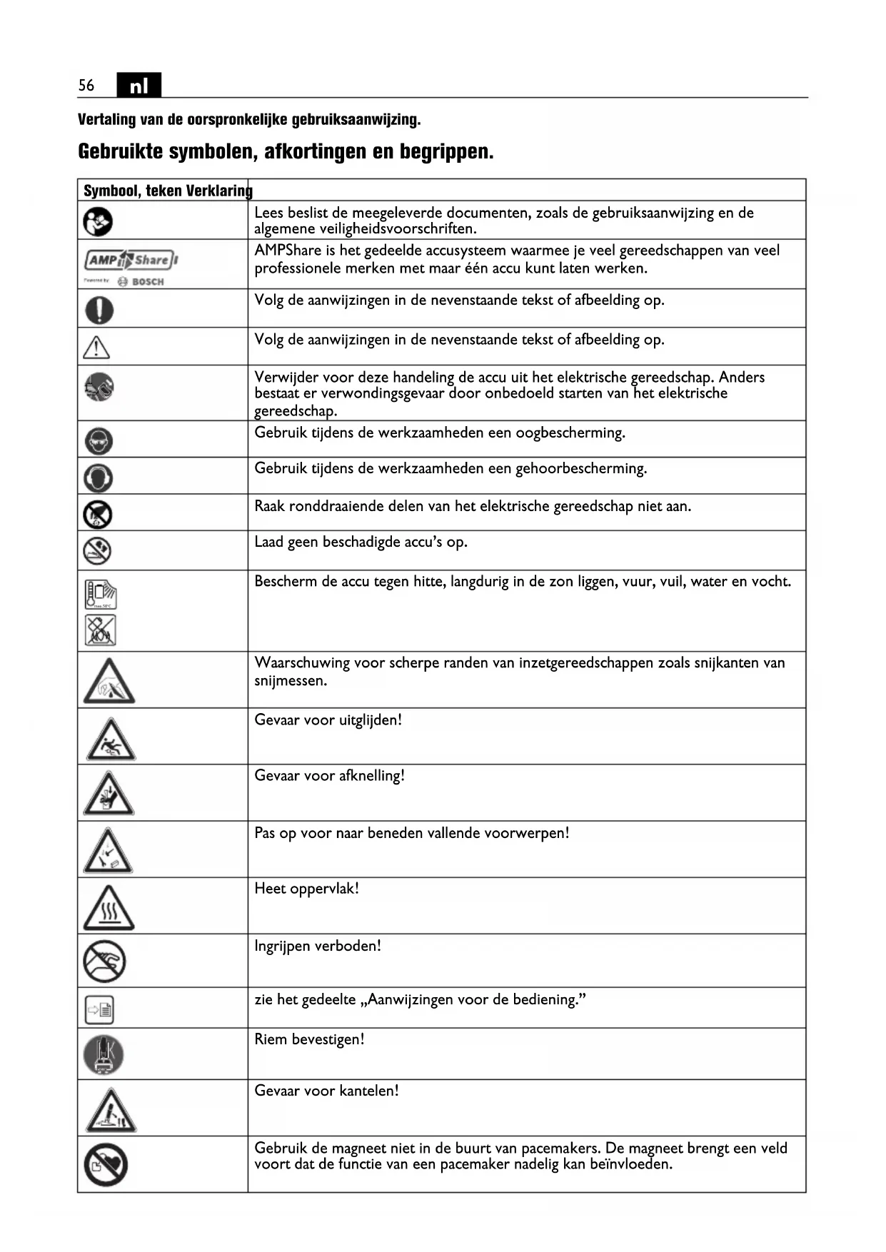 Vertaling van de oorspronkelijke gebruiksaanwijzing. Gebruikte symbolen, afkortingen en begrippen. Symbool, teken Verklaring Lees beslist de meegeleverde documenten, zoals de gebruiksaanwijzing en de algemene veiligheidsvoorschriften. AMPShare is het gedeelde accusysteem waarmee je veel gereedschappen van veel professionele merken met maar één accu kunt laten werken. Volg de aanwijzingen in de nevenstaande tekst of afbeelding op. Volg de aanwijzingen in de nevenstaande tekst of afbeelding op. Verwijder voor deze handeling de accu uit het elektrische gereedschap. Anders bestaat er verwondingsgevaar door onbedoeld starten van het elektrische gereedschap. Gebruik tijdens de werkzaamheden een oogbescherming. Gebruik tijdens de werkzaamheden een gehoorbescherming. Raak ronddraaiende delen van het elektrische gereedschap niet aan. Laad geen beschadigde accu’s op. Bescherm de accu tegen hitte, langdurig in de zon liggen, vuur, vuil, water en vocht. Waarschuwing voor scherpe randen van inzetgereedschappen zoals snijkanten van snijmessen. Gevaar voor uitglijden! Gevaar voor afknelling! Pas op voor naar beneden vallende voorwerpen! Heet oppervlak! Ingrijpen verboden! zie het gedeelte „Aanwijzingen voor de bediening.” Riem bevestigen! Gevaar voor kantelen! Gebruik de magneet niet in de buurt van pacemakers. De magneet brengt een veld voort dat de functie van een pacemaker nadelig kan beïnvloeden. max.50°C57