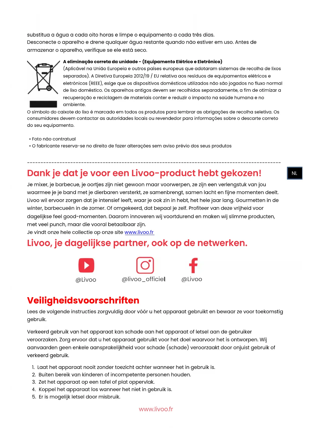 Dank je dat je voor een Livoo-product hebt gekozen! Je mixer, je barbecue, je oortjes zijn niet gewoon maar voorwerpen, ze zijn een verlengstuk van jou waarmee je je band met je dierbaren versterkt, ze samenbrengt, samen lacht en fijne momenten deelt. Livoo wil ervoor zorgen dat je intensief leeft, waar je ook zin in hebt, het hele jaar lang. Gourmetten in de winter, barbecueën in de zomer. Of omgekeerd, dat bepaal je zelf. Profiteer van deze vrijheid voor dagelijkse feel good-momenten. Daarom innoveren wij voortdurend en maken wij slimme producten, met veel punch, maar die vooral betaalbaar zijn. Je vindt onze hele collectie op onze site www.livoo.fr Livoo, je dagelijkse partner, ook op de netwerken.