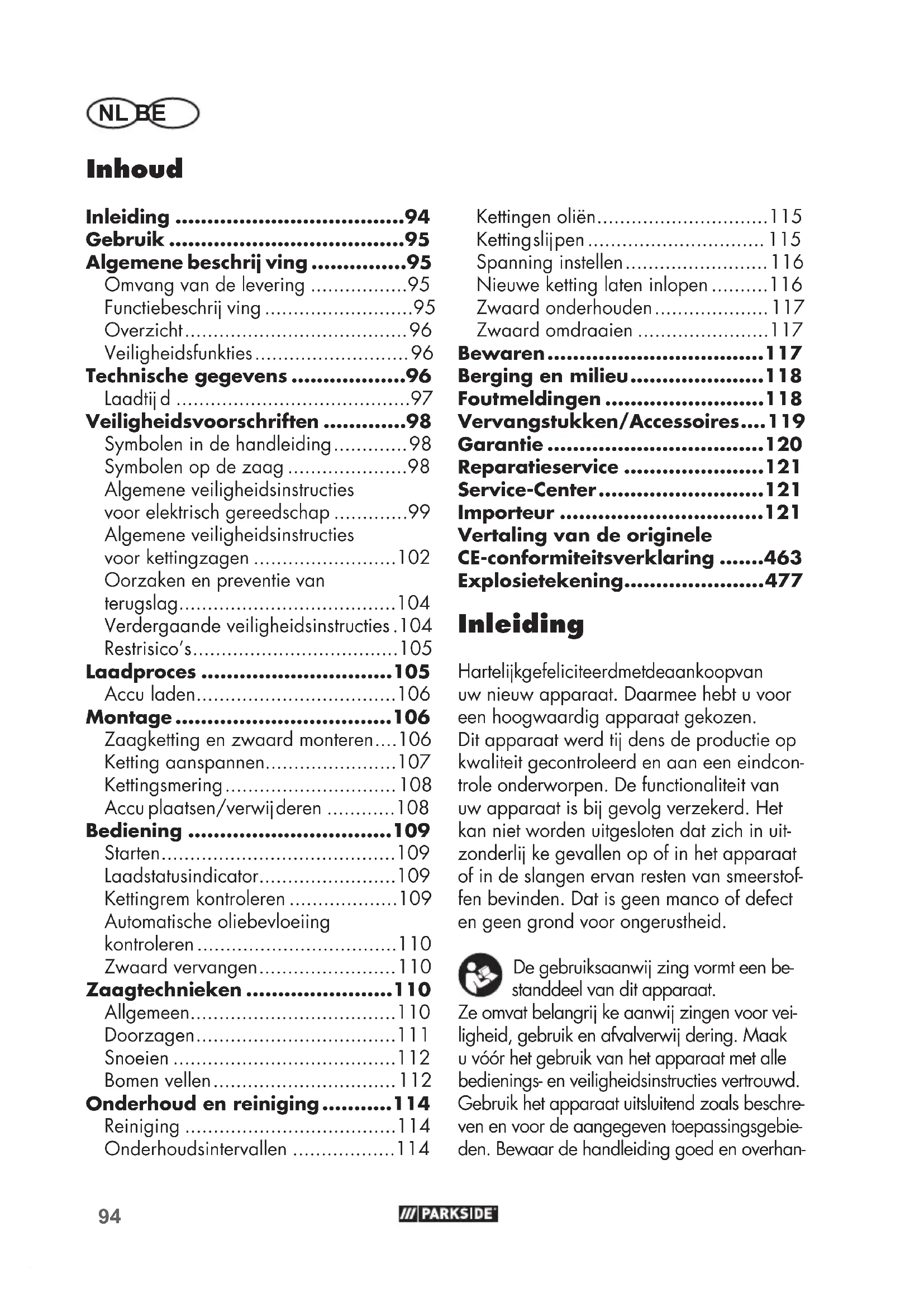 - Gebruiksaanwij zing De accu›s en de lader zij n niet meegeleverd. Zorg voor een reglementair voorgeschre- ven afvalverwij dering van het verpakkings- materiaal. Functiebeschrij ving De draadloze kettingzaag is voorzien van een ketting-snelspansysteem. De cirkel- zaagketting wordt over een zwaard (gelei- derail) geleid. Een automatisch oliesysteem zorgt voor continue kettingsmering. Om de gebruiker te beschermen, is het apparaat uitgerust met verschillende beveiligingsap- paraten. Hieronder wordt de functie van de bedie- ningsonderdelen omschreven. dig alle documenten bij het doorgeven van het apparaat mee aan derden. Gebruik De akku-kettingzaag is enkel voor het zagen van hout gekonstrueerd. Voor alle andere toepassingen (bv. het snij den van metselwerk, kunststoffen of levensmiddelen) is de zaag niet geschikt. De kettingzaag is voor de doe-het-zelver bedoeld. Ze werd niet voor industriëel langdurig gebruik ontwikkeld. Het apparaat maakt deel uit van de reeks ( Parkside) X20VTEAM en kan met accu‘s van de reeks ( Parkside) X20VTEAM worden gebruikt. De accu‘s mogen alleen met originele laders van de serie ( Parkside) X20VTEAM worden geladen. De machine is voor gebruik door volwas- senen bedoeld. Jongeren onder de 16 jaar mogen enkel onder toezicht de ketting- zaag gebruiken. De producent is niet verantwoordelij k voor schade die veroorzaakt wordt door foute bediening of door gebruik bij toepassin- gen waarvoor de zaag niet geschikt is. Dit apparaat is niet geschikt voor commercieel gebruik. Bij commercieel gebruik vervalt de garantie Deze elektrische kettingzaag mag slechts door één persoon en uitsluitend voor het zagen van hout gebruikt worden. De ket- tingzaag moet met de rechterhand aan de achterste handgreep en met de linkerhand aan de voorste handgreep vastgehouden worden. Vóór gebruik van de kettingzaag moet de gebruiker alle in de gebruiksaan- wij zing vermelde opmerkingen en aanwij - zingen gelezen en begrepen hebben. De gebruiker moet gepaste persoonlij ke be- schermingsmiddelen (PBM) dragen. Met de kettingzaag mag uitsluitend hout gezaagd worden. Materialen zoals bij voorbeeld96 NL BE Overzicht 1 Achterste handgreep 2 Aan-/uitknop 3 Inschakelblokkering 4 Olietankdop 5 Voorste handgreep 6 Kettingremhendel/ voorste handbescherming 7 Zaagketting 8 Zwaard (geleiderail) 9 Aanslagtand 10 Bevestigingsschroef voor ketting- wielafdekking 11 Schroef voor ketting-snelspansys- teem 12 Kettingwielafdekking 13 Oliepeil-indicatie 14 Achterste handbeveiliging 15 Zwaardbeschermingskoker 16 Accu 16a Ontgrendelknop accu 17 Lader 18 Oliefl es 19 Railpin 19a Pen 20 Kettingrondsel 21 Kettingspanbalkje 22 Houder van kettingspanbalkje 23 Geleiderail voor accu 24 Oliedoorlaat Veiligheidsfunkties 1 achterste handvat met bescher- ming voor de hand (14) beschermt de hand tegen takken en twij gen en als de ketting losspringt. 2 Aan-/uitschakelaar met ketting- blokkering bij loslaten van de aan- en uitschake- laar stopt de machine onmiddellij k 3 startvergrendeling om de machine te kunnen starten, moet eerst de startvergrendeling ontgrendeld worden. 6 kettingremhendel/bescherming van de hand Veiligheidsvoorziening, die de ketting bij terugslag onmiddellij k stopzet; de hendel is ook manueel te gebruiken; beschermt de linker hand van de ge- bruiker als deze van het voorste hand- vat afglij dt. 7 ketting met lichte terugslag helpt u door speciaal ontwikkelde vei- ligheids voorzieningen terugslagen op te vangen. 9 klemmhendel versterkt de stabiliteit als vertikale sne- des doorgevoerd worden en maakt het zagen makkelij ker. Technische gegevens Akku-kettingzaag 20V .................. ................................PKSA 20-Li C3 Motorspanning ..........................20 V Beschermingsklasse ..........................IPX0 Kettingsnelheid v