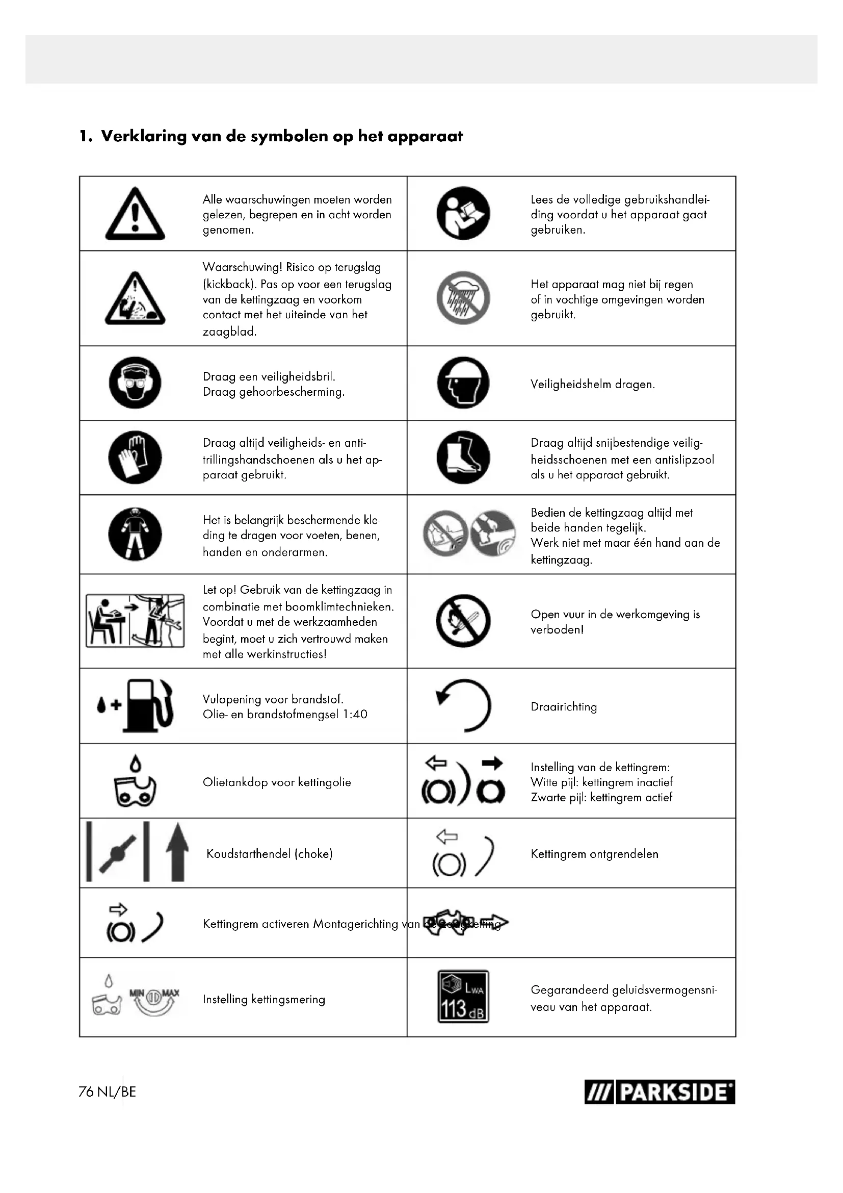 m WAARSCHUWING Wees altijd voorzichtig, let op waar u mee bezig bent en ga met gezond verstand te werk bij werkzaamheden met het ap- paraat. Gebruik het apparaat niet als u ziek of moe bent of onder invloed bent van drugs, alcohol of medicamenten. Een moment van onachtzaamheid bij het gebruik van het apparaat kan leiden tot ernstig letsel. Voorkom verkeerd gebruik en pas de machine uitsluitend toe voor werk genoemd onder “Beoogd gebruik”. De gebruikshandleiding bevat belangrijke informatie over hoe u veilig en vakkundig met de kettingzaag kunt werken en hoe u gevaren kunt voorkomen.80 NL/BE Als er toch een verstopping optreedt tussen het snoeimateri- aal en de zaagketting, dient u de machine onmiddellijk uit te schakelen. Wacht tot de zaagketting tot stilstand is gekomen. Verwijder de bougiestekker en trek snijbestendige handschoe- nen aan om de verstopping te verwijderen. Als het geleideblad (zaagblad) moet worden verwijderd, volg dan de aanwijzin- gen zoals beschreven in het hoofdstuk “Montage”. Na het ver- wijderen van de verstopping en het opnieuw monteren, moet een testrun worden gemaakt. Indien tijdens dit proces trillingen of mechanische geluiden wor- den waargenomen, stop dan met de werkzaamheden en neem contact op met een erkend servicecentrum. Mocht dit gevaar zich vaker voordoen, dan adviseren wij een nieuwe instructie. ■ Lees voor de ingebruikname de gebruikshandleiding van uw apparaat en neem hierbij met name de veiligheidsvoor- schriften in acht. ■ De op het apparaat aangebrachte waarschuwings- en in- structiebordjes geven belangrijke aanwijzingen voor een veilig gebruik. ■ Naast de aanwijzingen in de gebruikshandleiding moeten de algemene veiligheids- en ongevallenpreventievoorschrif- ten van de wetgever in acht worden genomen. ■ Verpakkingsfolies uit de buurt van kinderen houden. Er be- staat verstikkingsgevaar! ■ Bij onvakkundig gebruik kunnen onvoldoende geïnformeer- de gebruikers zichzelf en anderen in gevaar brengen. De gebruiker is verantwoordelijk voor derden. ■ Controleer de werking van de gashendel voordat u met de werkzaamheden begint. Deze moet na het loslaten automa- tisch in de stationaire stand terugkeren. ■ Werk niet langer dan 10 minuten achter elkaar. Wij advise- ren, om tussen de bewerkingen steeds een pauze van 10tot 20 minuten te nemen. ■ Leen het apparaat alleen uit aan gebruikers die ervaring hebben met het apparaat. Overhandig daarbij de gebruiks- handleiding. ■ Bepaald zaagwerk vraagt om een speciale training en vaar- digheden. Raadpleeg een specialist als u twijfelt of vragen heeft. ■ Beginnende gebruikers moeten zich de eigenschappen en het gebruik van het apparaat laten uitleggen. Bezoek voor uw eigen veiligheid een door de overheid georganiseerde motorzaagcursus. ■ Wanneer het apparaat niet wordt gebruikt, moet het zo wor- den bewaard dat niemand in gevaar wordt gebracht. Zorg dat onbevoegden er niet bij kunnen. ■ De gebruiker is verantwoordelijk voor alle ongevallen en gevaren waarbij andere personen of hun eigendommen betrokken zijn. ■ Kinderen, jongeren en personen met verminderde lichame- lijke, zintuiglijke of geestelijke vermogens mogen de ket- tingzaag niet gebruiken. Er kan een uitzondering worden gemaakt voor jongeren vanaf 16 jaar in het kader van een opleiding en onder toezicht van een beroepsbeoefenaar. ■ De elektrische ontsteking van het apparaat genereert een laag elektromagnetisch veld. Als u een pacemaker of een soortgelijk implantaat draagt, raadpleeg dan uw arts voordat u het apparaat gebruikt om gezondheidsrisico’s te voorkomen. ■ Let op: onjuist onderhoud, het gebruik van niet-conforme reserveonderdelen of het verwijderen of wijzigen van veilig- heidsvoorzieningen kan materiële schade aan het apparaat en lichamelijk letsel van de persoon die ermee werkt tot gevolg hebben.